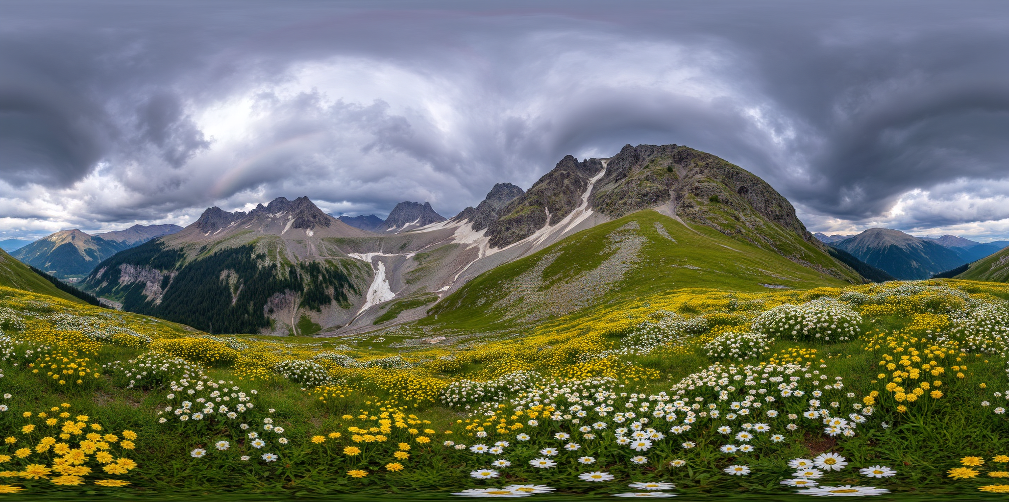 英文:Create a panoramic mountain meadow covered in yellow and white wildflowers, with rugged peaks (some dusted with snow) in the background, a dramatic sky with dark storm clouds and a faint rainbow, capturing the contrast between the vibrant flora and the moody sky.