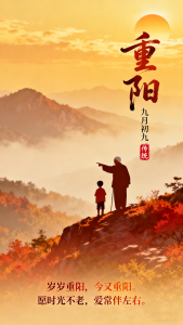 视觉元素:右侧突出盛放的黄色菊花(呼应重阳节 “赏菊” 习俗);背景点缀亭台楼阁剪影,体现 登高望远”的节日活动;右下角一对相伴的人物剪影,传递出敬老陪伴的温情。 文字表达:左下角以书法字体呈现 “重阳节”,下方搭配英文 “Double Ninth Festival”,明确节日;