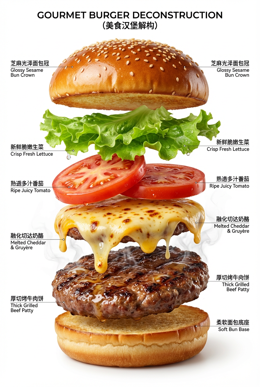 {创建美食汉堡超现实垂直爆炸信息图。从顶部:柔软光泽芝麻面包冠,带有可见芝麻籽;下方是新鲜生菜叶、成熟番茄片、融化奶酪、厚实烤牛肉饼;底部是柔软面包底座。纯白背景... 高端快餐生活美学,写实风格。}
