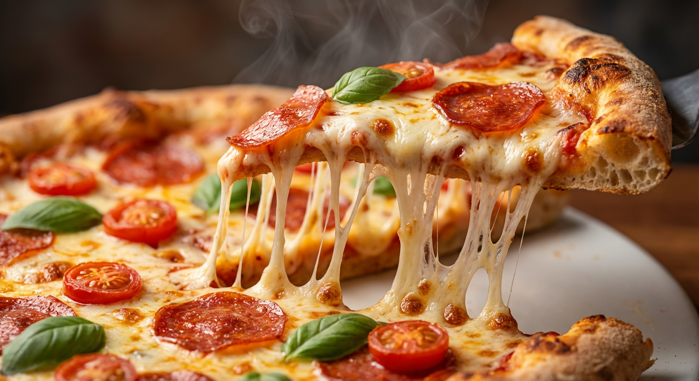 A hyper-realistic, cinematic close-up of a freshly baked pepperoni pizza slice being lifted from the pie, with long, dramatic cheese pulls stretching down in silky strands. Golden, slightly charred crust with visible texture, bubbling mozzarella, glossy pepperoni slices, fresh basil leaves on top, and juicy cherry tomatoes scattered across the pizza. Soft steam rising from the hot slice, creating a warm, mouth-watering atmosphere. Shot on a DSLR, 50mm lens, shallow depth of field, sharp focus on the cheese stretch, background softly blurred. Warm studio lighting with natural highlights, rich colors, realistic shadows, premium food-advertisement look.