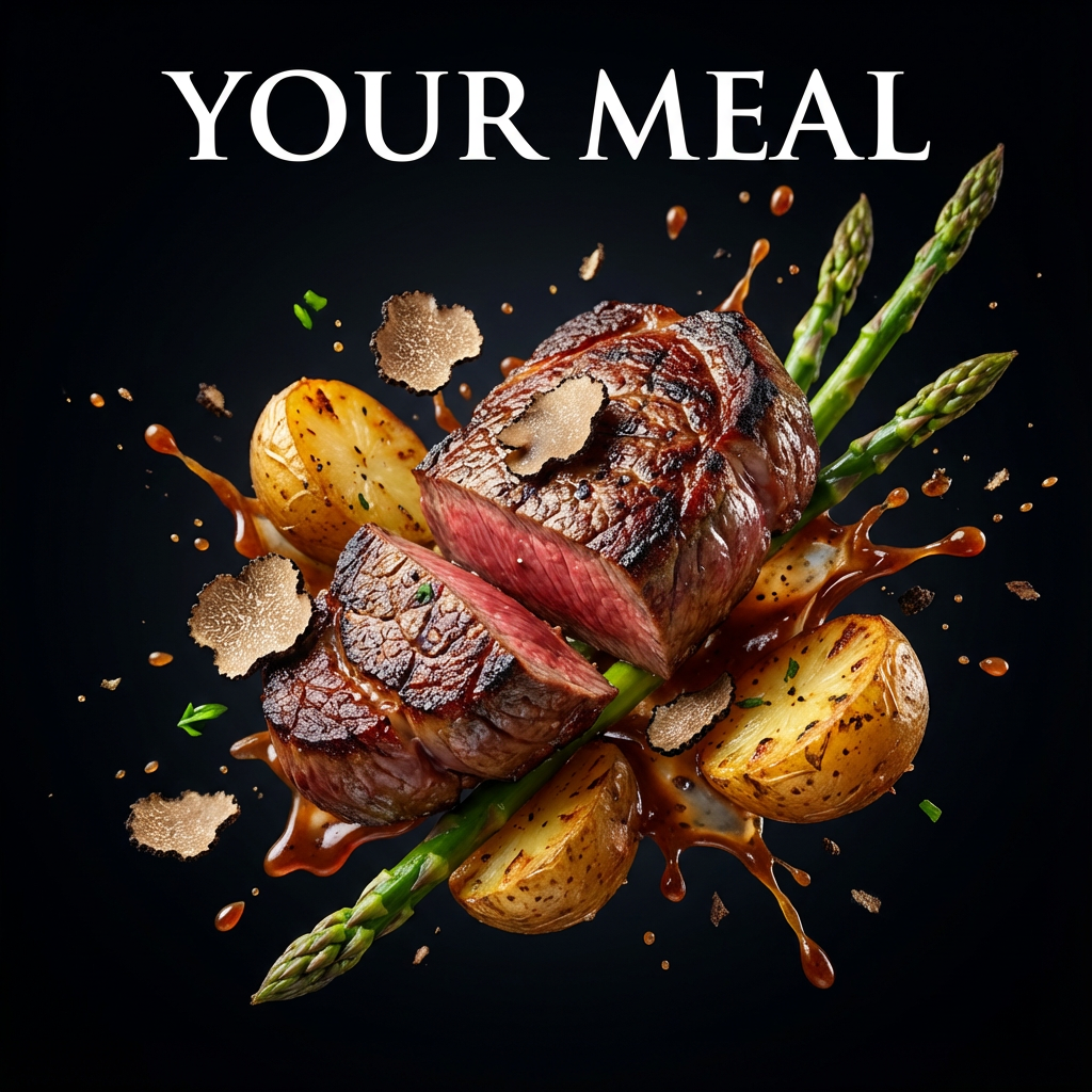 创建高分辨率正方形(1:1)食物海报(YOUR MEAL)。捕捉菜肴在动态、爆炸式构图中向观众爆发。以现实、令人垂涎纹理和生动颜色呈现。放置在深黑背景上带有戏剧性专业工作室照明,丰富景深和高对比。强调优质、奢侈和视觉冲击感。排除任何手、人、文本、标志或干扰餐具。