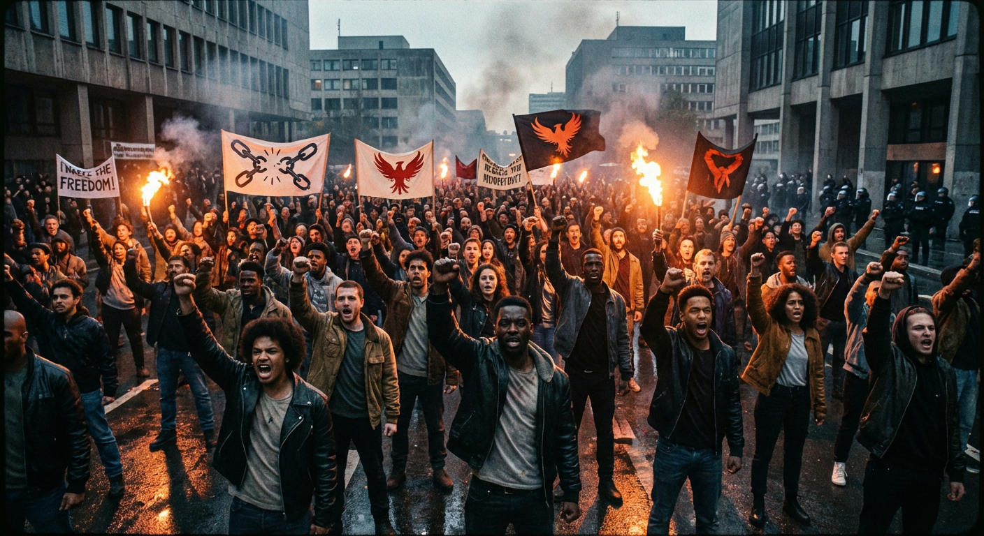 Powerful protest scene, bold cinematic style — defiant crowd with raised fists, intense expressions, dramatic lighting, gritty realism, revolutionary mood, strong contrast, symbolic flags, raw energy, freedom uprising atmosphere.