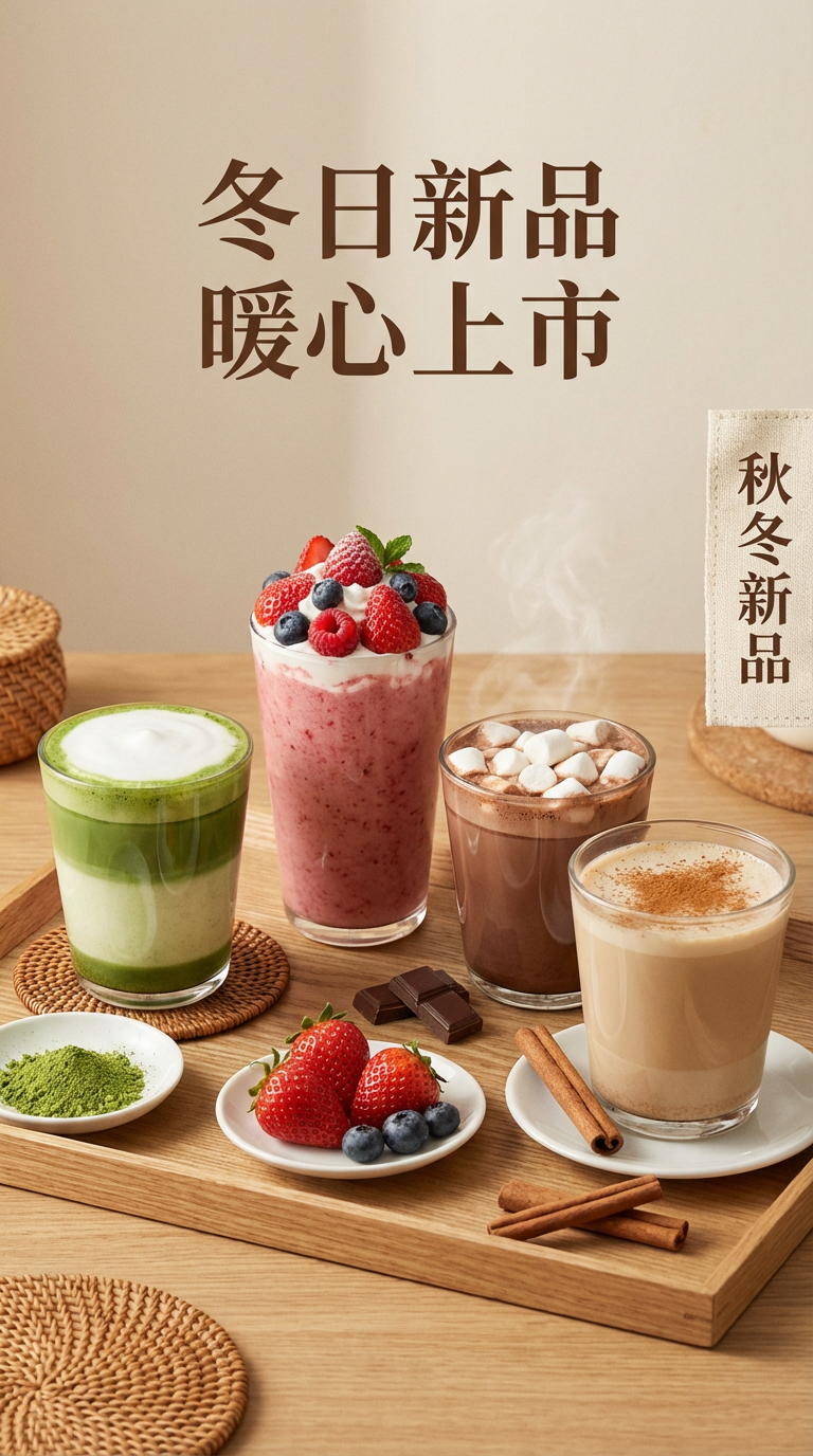 比例 9:16,主体是四杯冬日饮品(含抹茶分层、草莓沙冰,旁配原料小碟);背景为浅米色简约底。文字居上是 “冬日新品 暖心上市”,侧边挂 “秋冬新品” 标签。风格简约温暖冬日风,色彩柔和低饱和,光影温馨,构图饮品居中排列,文字置顶,氛围暖糯治愈。