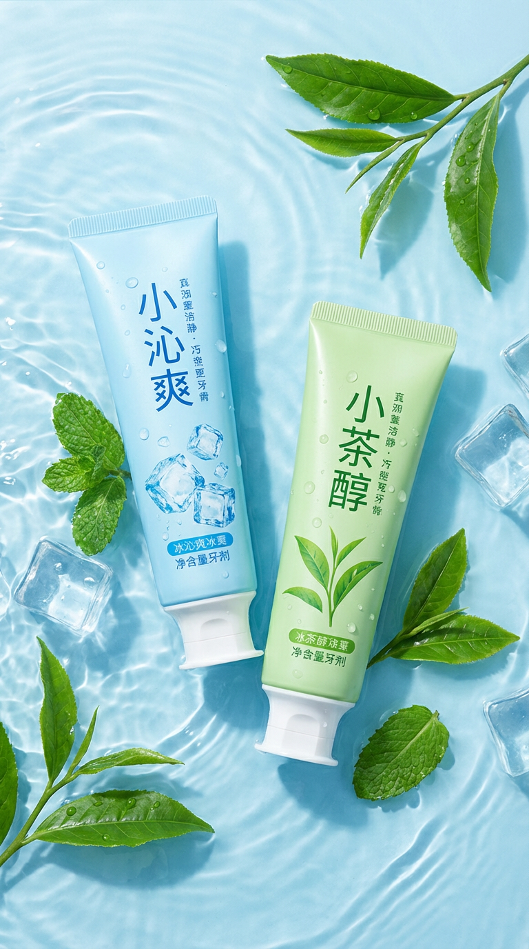 比例 9:16,画面主体是两支牙膏,一支标注 “小沁爽”,一支标注 “小茶醇”,置于浅蓝色水波纹与冰块组成的清凉背景中,点缀新鲜绿叶;牙膏包装印有对应标识。风格:冰蓝清凉色调,水润通透光影,商业清新产品风,错落自然构图,氛围清爽沁凉。