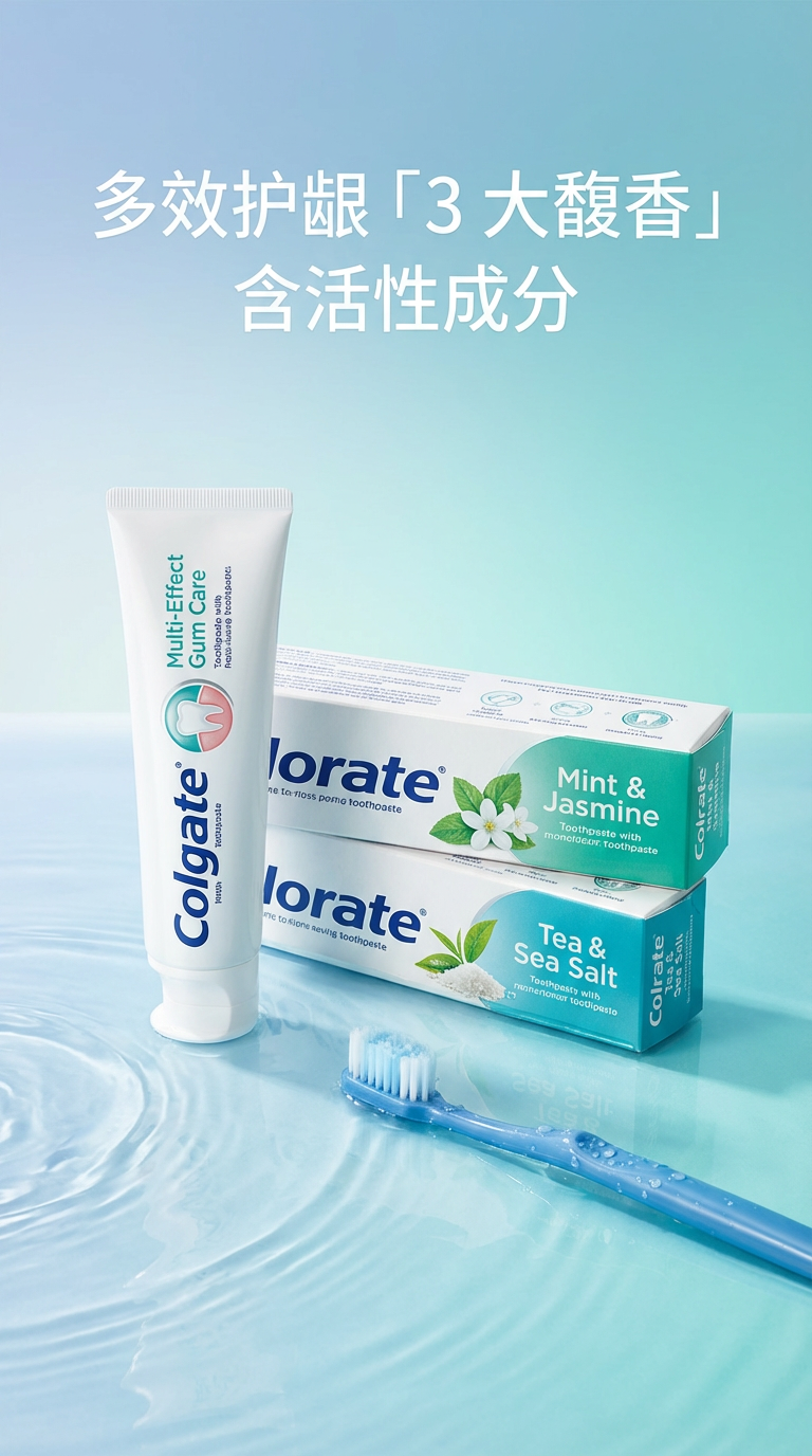 Ratio 9:16, the main subject of the picture is a tube of toothpaste, two boxes of toothpaste and a toothbrush, placed against a background of light blue gradient + water ripples; in the center of the top is the text "Multi-effect Gum Care 「3 Great Fragrances」 Contains Active Ingredients". Style: Fresh light blue main color, soft gradient light and shadow, commercial product photography style, combined scattered composition, rich visual hierarchy.
