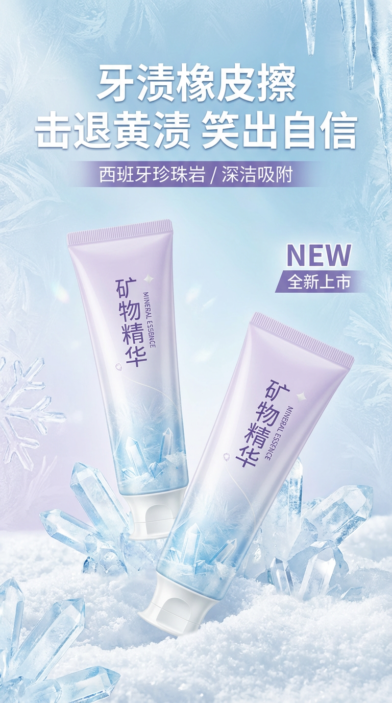 比例 9:16,画面主体是两支标注 “矿物精华” 的牙膏,功效为美白去渍,背景是浅蓝渐变 + 冰雪质感元素;顶部是 “牙渍橡皮擦 击退黄渍 笑出自信” 文字,搭配 “西班牙珍珠岩 / 深洁吸附” 说明,右侧有 “NEW 全新上市” 标识。风格:清新冰透感,淡紫 + 蓝白配色,柔和通透光影,商业新品推广风,错落式构图,氛围清爽治愈。