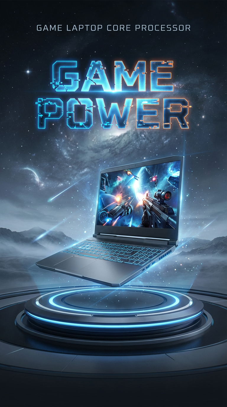 9:16 比例,画面主体是打开的游戏笔记本电脑,悬浮在带发光环的深色平台上;背景是星际纹理天幕与朦胧山峦,顶部有 “GAME LAPTOP CORE PROCESSOR” 小字,中间是破碎像素风 “GAME POWER” 主文字。画面美学:电竞科技风电商海报,深灰 + 冷蓝主色,星际冷调光影,悬浮动态构图,硬核游戏科技质感。