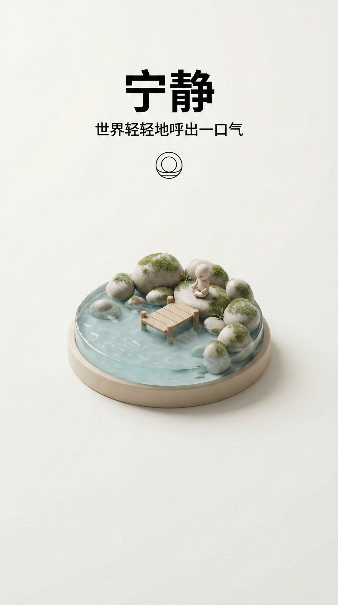 "prompt":呈现一个清晰的、45°俯视角的等距微缩 3D 场景,用于表达情绪「宁静」。