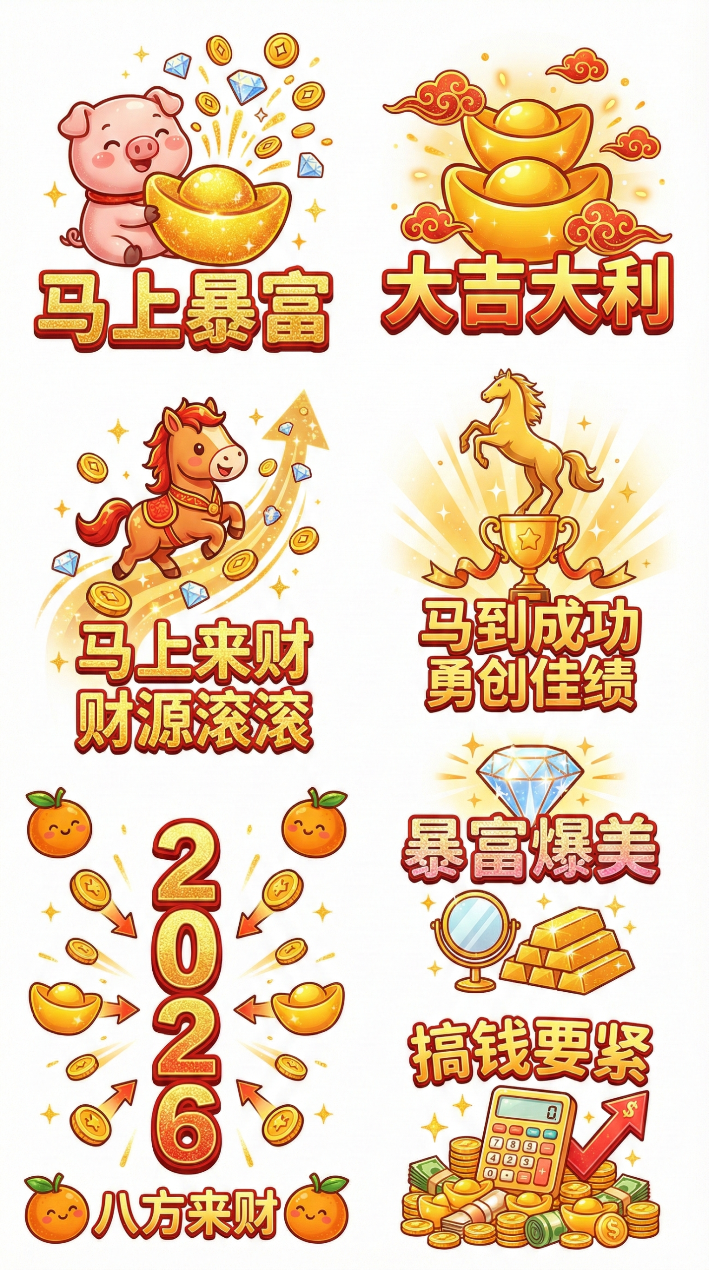一组适用于AI绘图的新年祝福贴纸提示词设计,整体采用喜庆卡通风格与简洁排版,红金橙配色搭配白色背景,点缀闪光元素增强节日氛围。画面为9:16竖版构图,突出财富与好运主题,包含小猪存钱罐、金元宝、钻石、橘子等吉祥元素,适合用于社交媒体贴纸、电商装饰、海报设计及新年视觉物料,传递“暴富、来财、成功”的积极寓意。