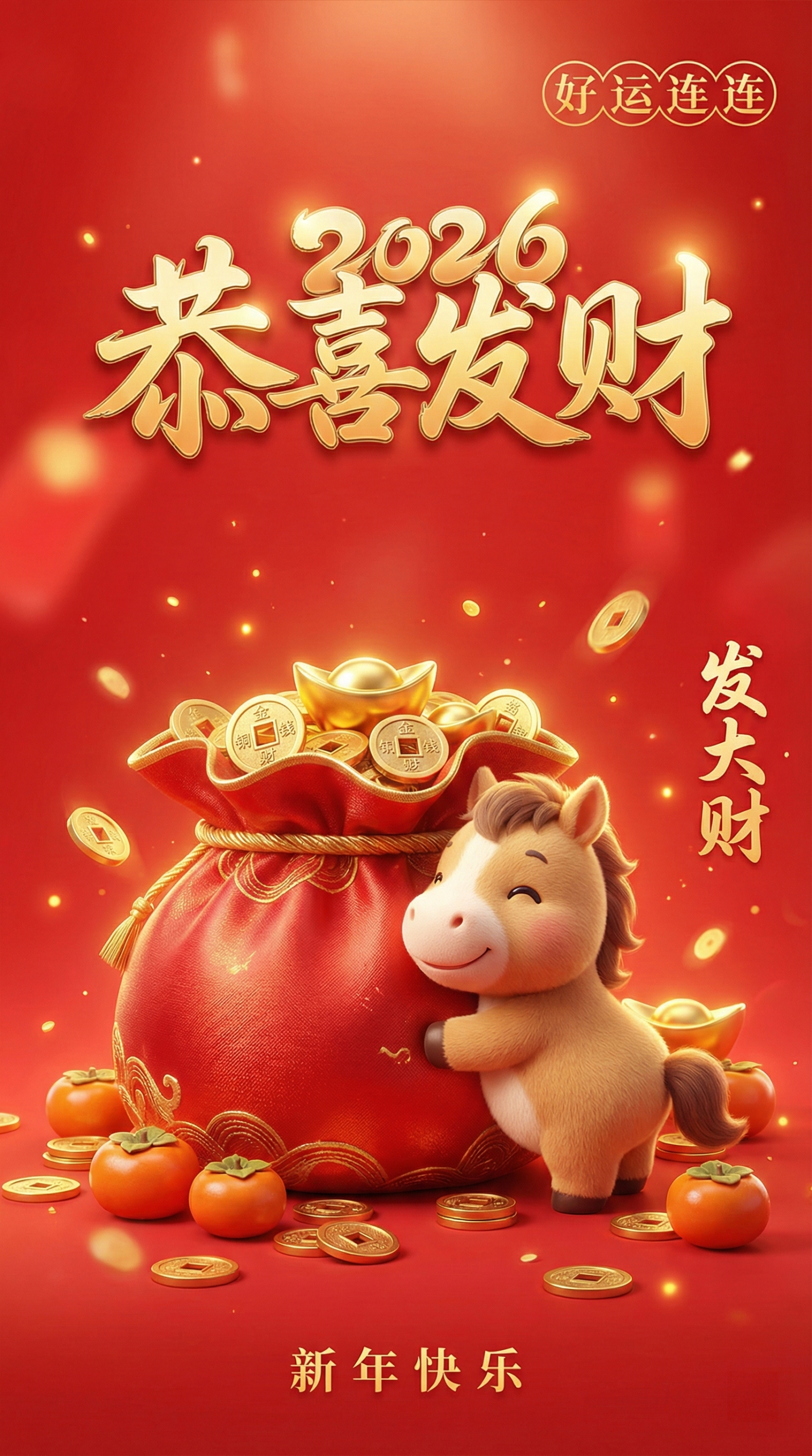 以喜庆中国红为主调,融合Q版马年吉祥物与金元宝元素,营造热闹祥和的新春氛围。寓意新的一年好运相随、财运亨通,让祝福更具视觉吸引力与节日仪式感,适用于电商活动、品牌宣传及春节营销场景。