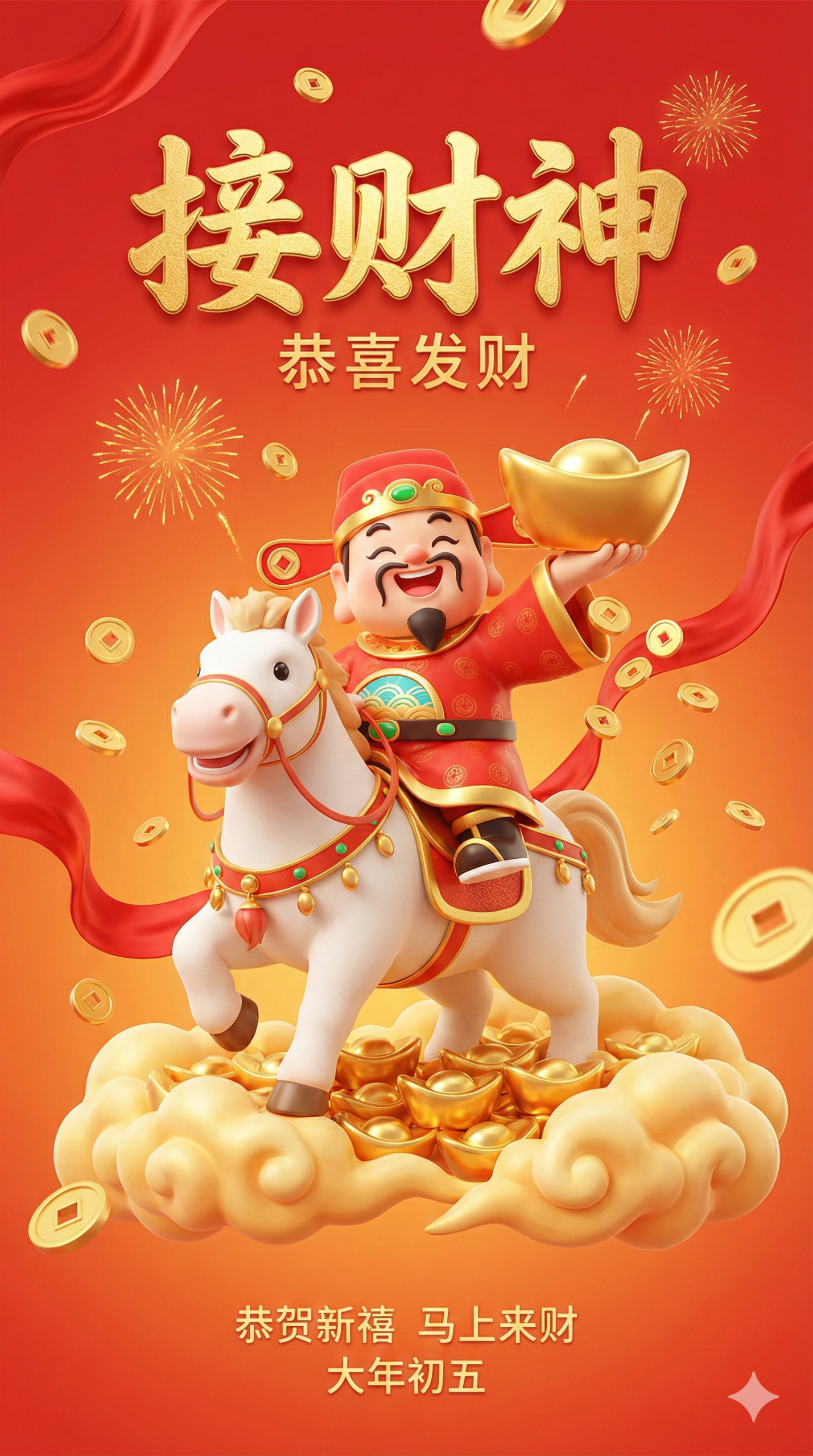 "中文": "画面中心是骑在白马上的3D卡通财神,财神笑容满面,一手托大金元宝,一手抛洒金币;白马踏在满是金元宝的祥云之上,画面顶部是烫金书法大字,底部是祝福文案"