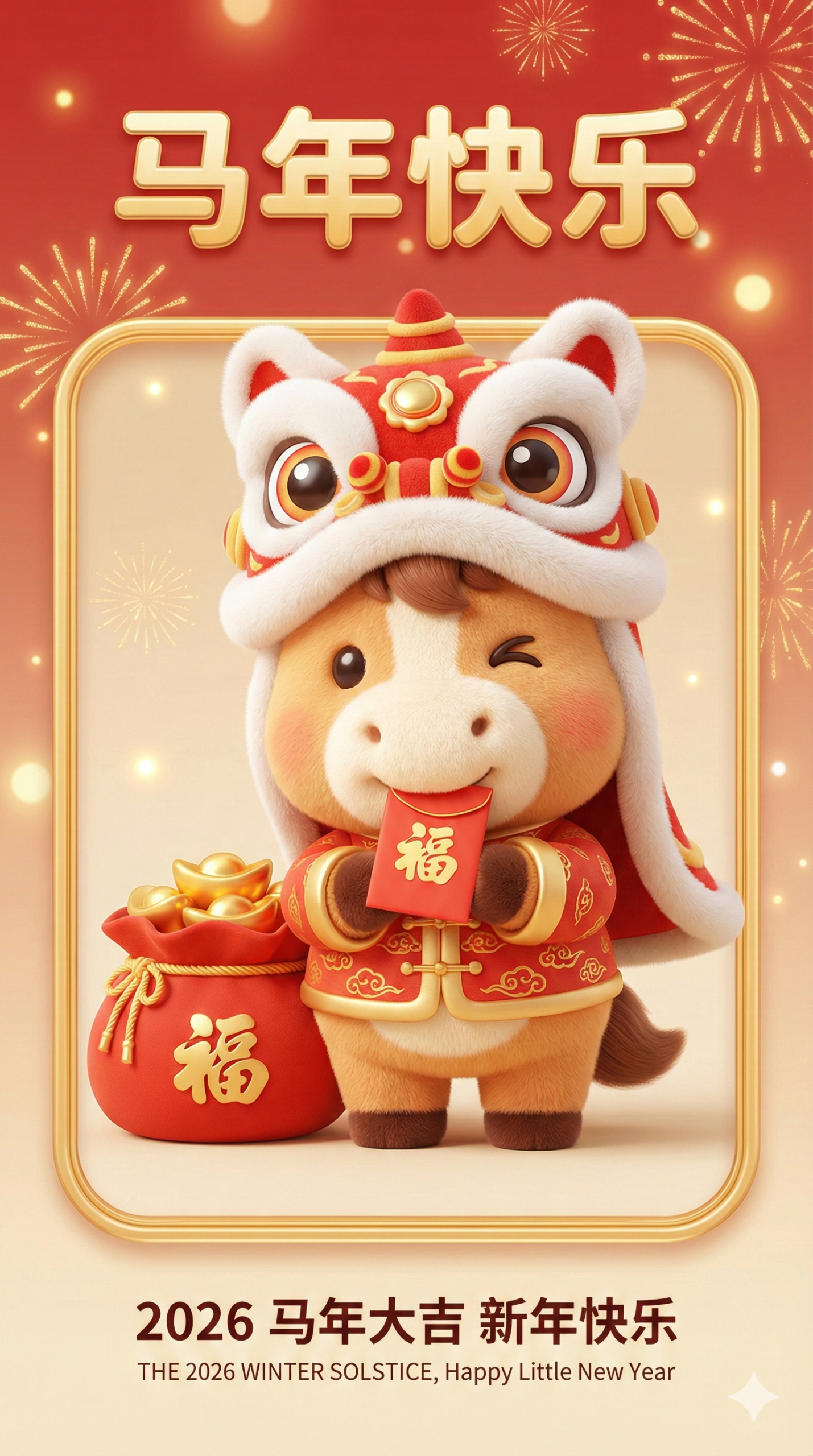 "中文": "画面中心是戴红白醒狮头套、穿祥云纹新年唐装的3D卡通萌马,单眼眨眼wink,嘴里叼着红色红包;萌马左侧是装满金元宝、带福字的红色福袋,整体被金色圆角边框包裹"