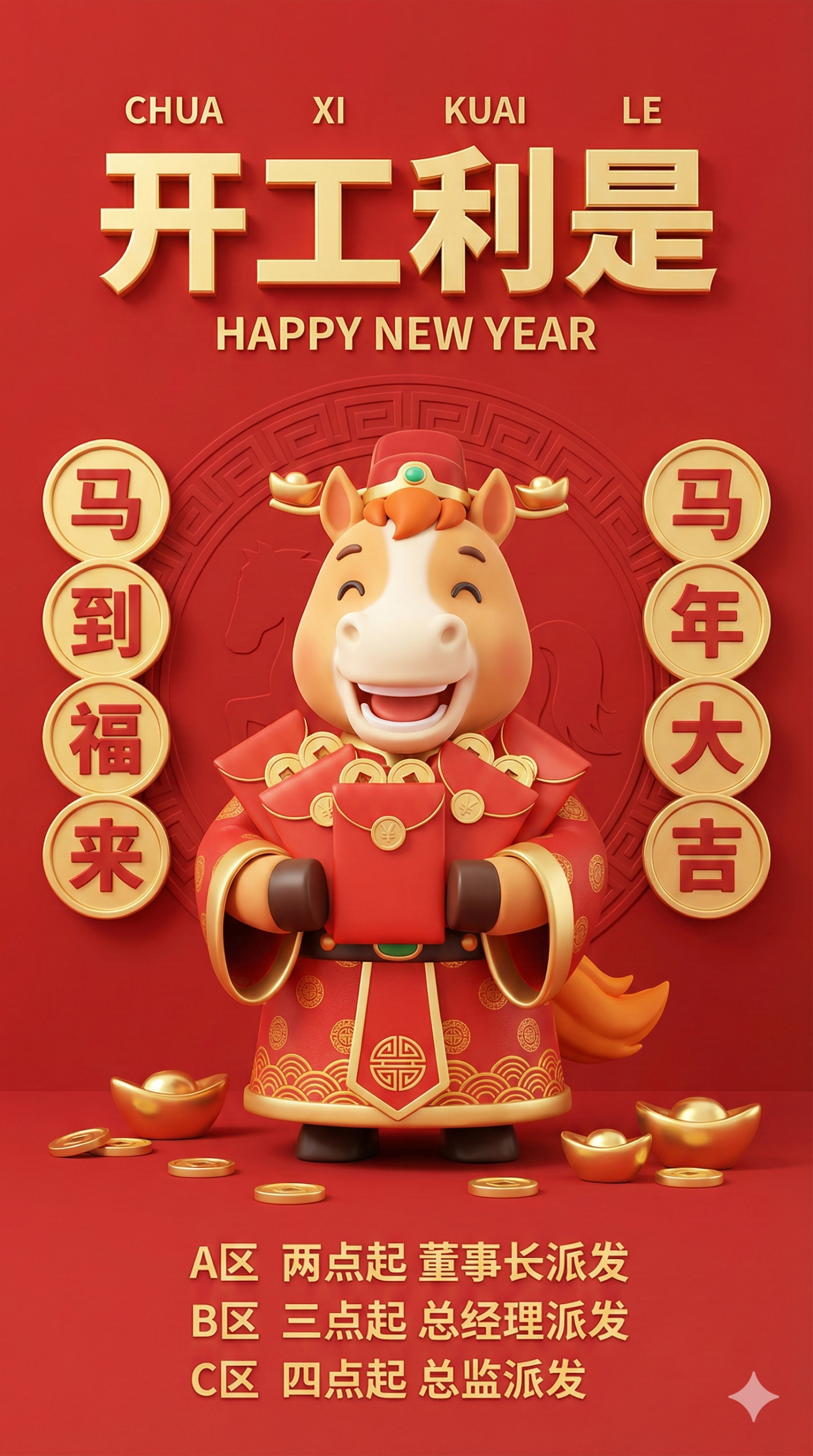 "中文": "画面中心是穿新年官服、戴财神帽的3D卡通萌马,双手抱着多个红色红包,笑容灿烂;萌马左右两侧是竖排圆形吉祥文案,画面点缀金币、金元宝元素,底部是开工利是派发信息"