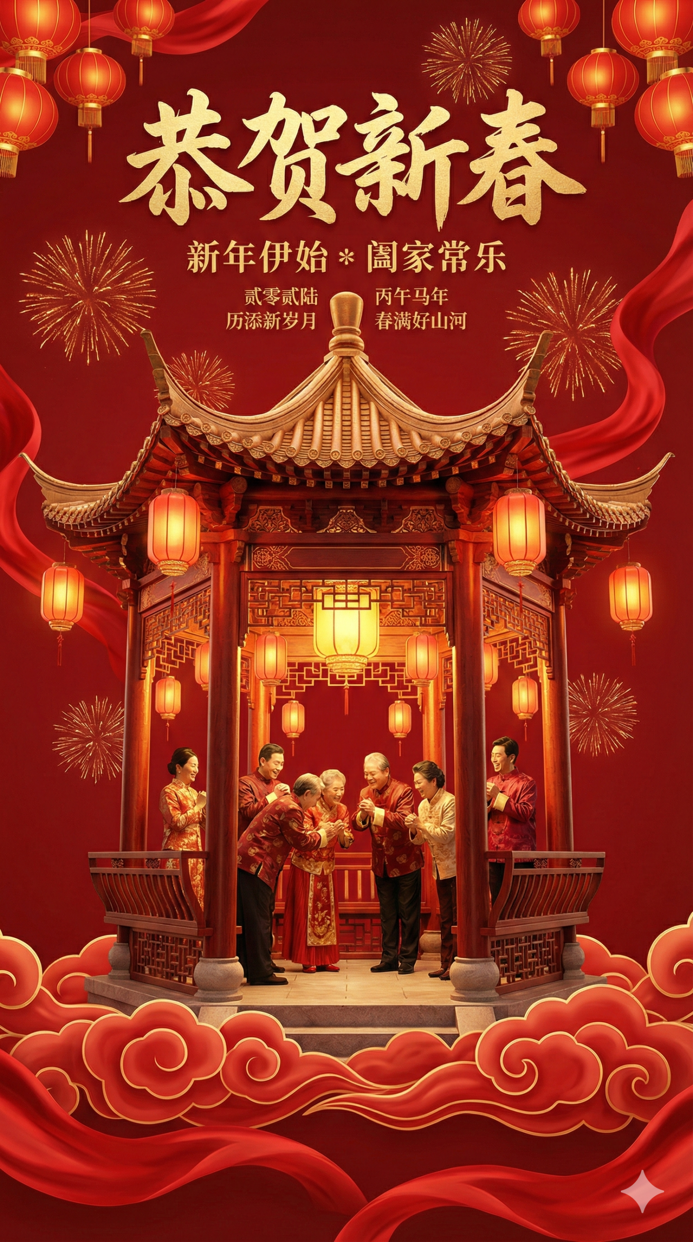 "中文": "以恭贺新春为核心,结合中式古亭与阖家拜年的传统人物形象,打造氛围感拉满的马年新春团圆祝福视觉"