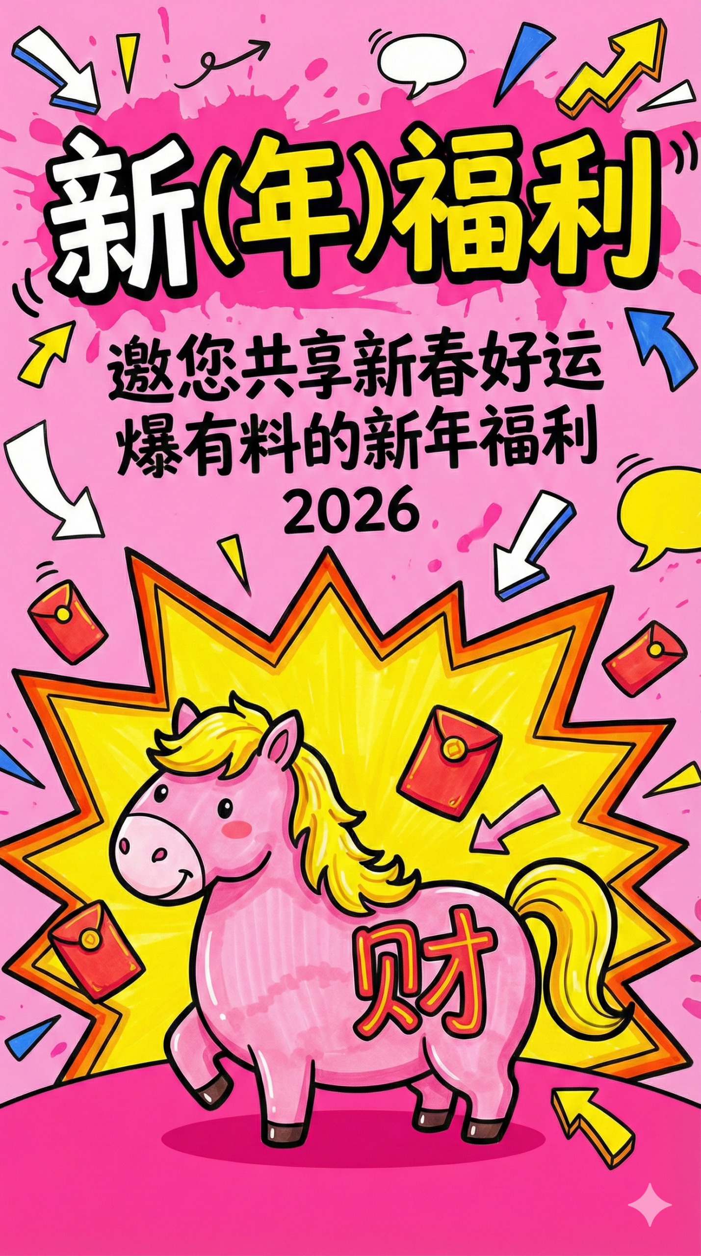 "中文": "画面下半部分是带“财”字的粉色卡通小马,背后是黄色爆炸形底衬,周围点缀红色红包、箭头装饰元素;小马造型圆润可爱,带黑色描边,整体是手绘涂鸦风格"