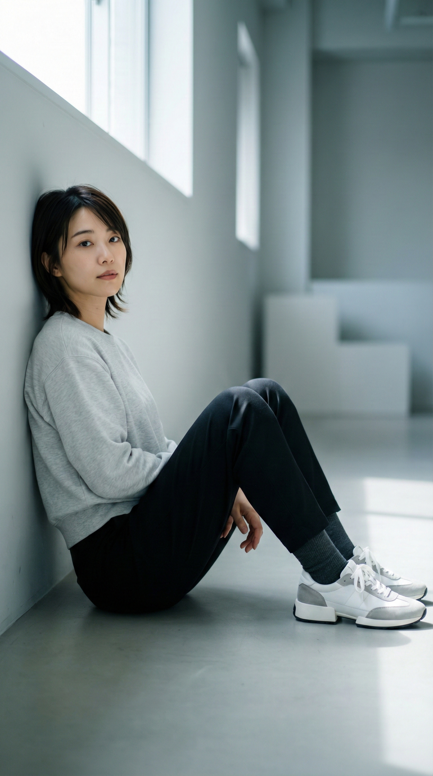 "位置": "背靠浅色墙面坐着",