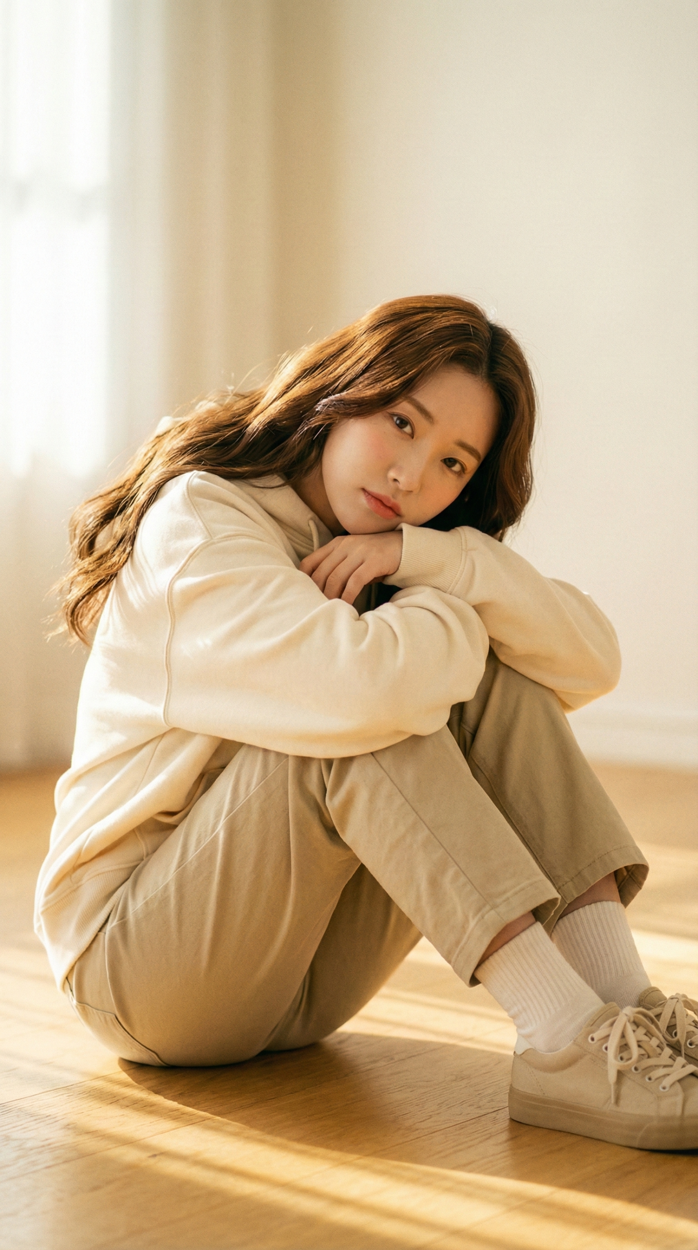 "细节": "屈膝坐姿,双臂环抱膝盖,下巴轻靠在手臂上",