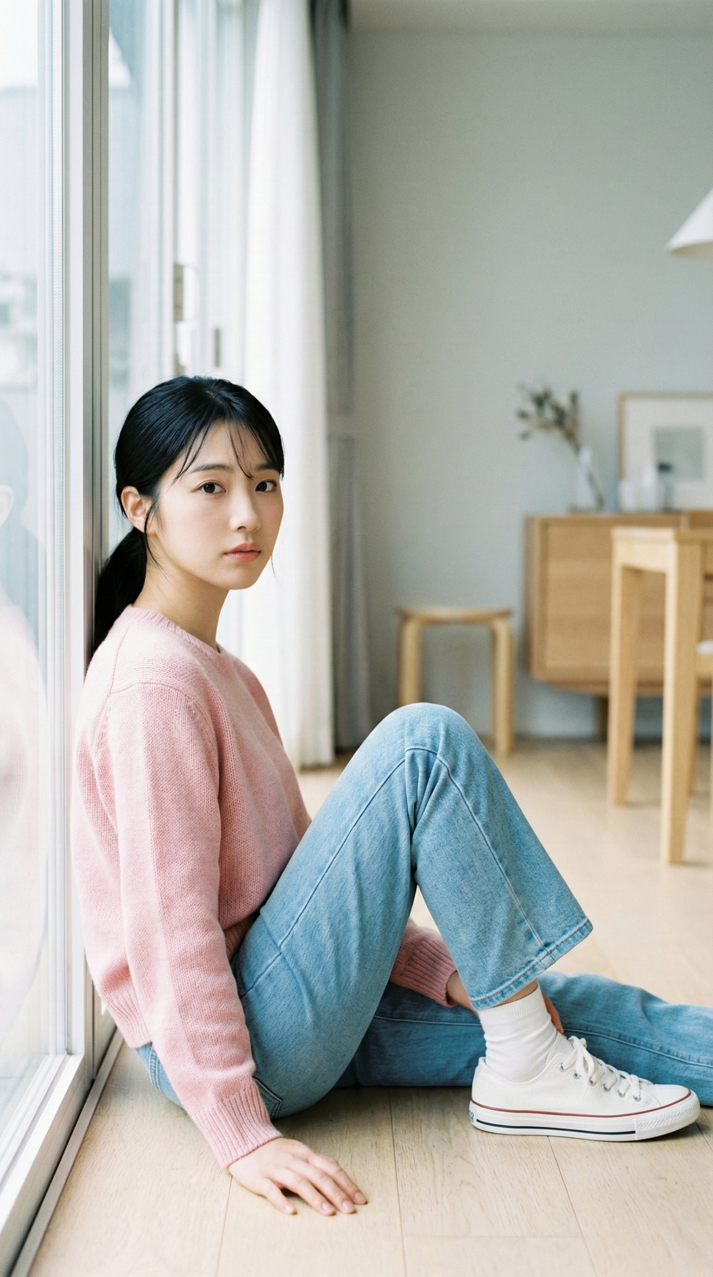 "位置": "坐在大窗旁的地面",