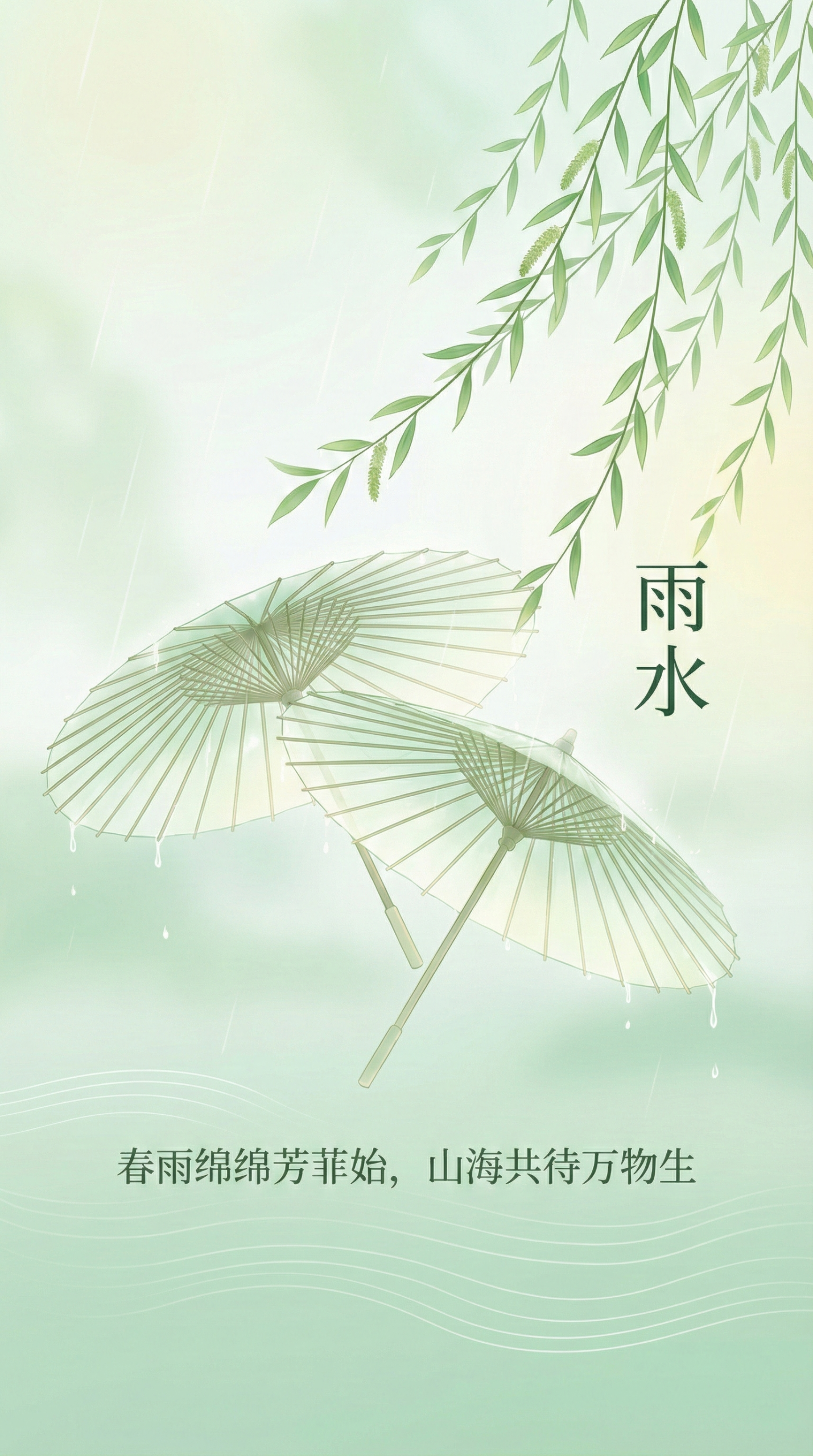 "元素细节": "两把半透明油纸伞呈淡绿色,位于画面中下部,柳枝从右上角垂下,“雨水”文字位于伞面右侧"