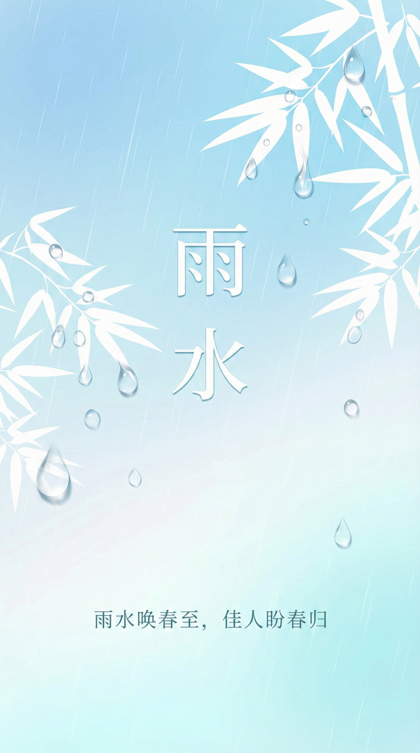 "元素细节": "竹叶呈白色剪影,分布在画面中,水滴如透明的雨珠,“雨水”文字位于画面中心"