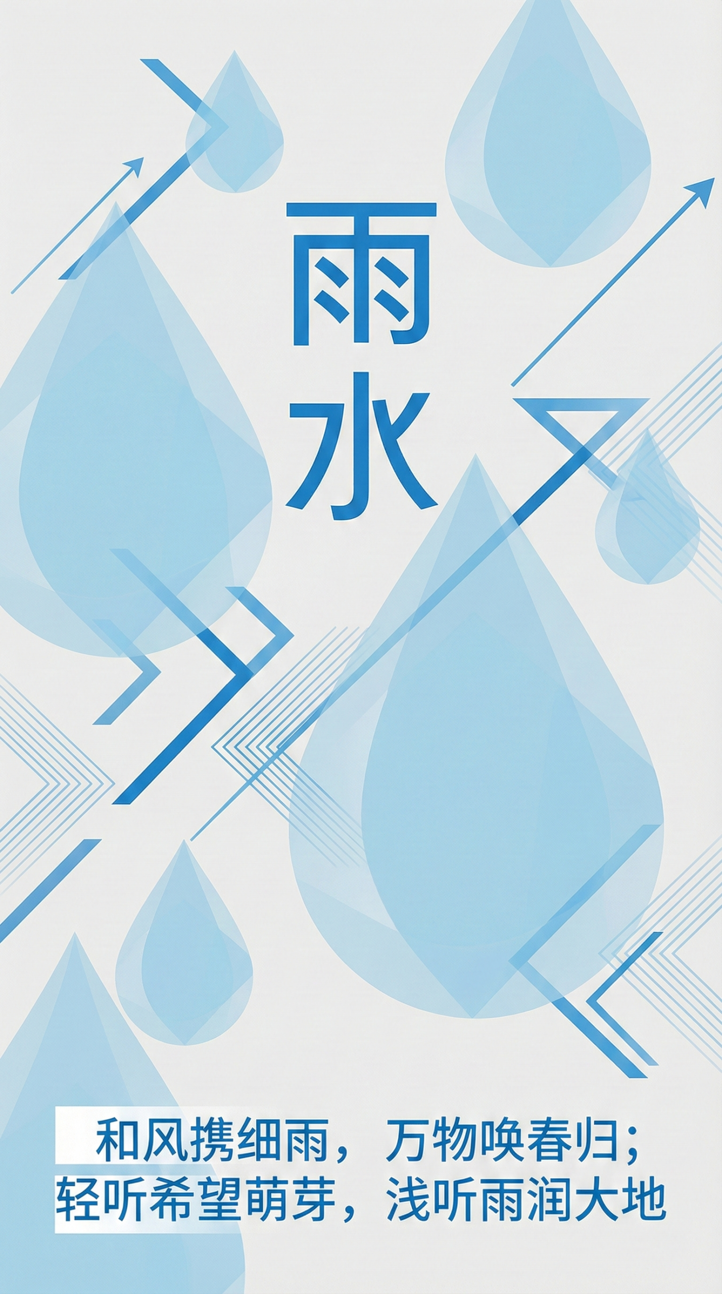 "元素细节": "淡蓝色半透明水滴分布在画面中,“雨水”文字为蓝色粗体,几何线条如箭头状点缀"