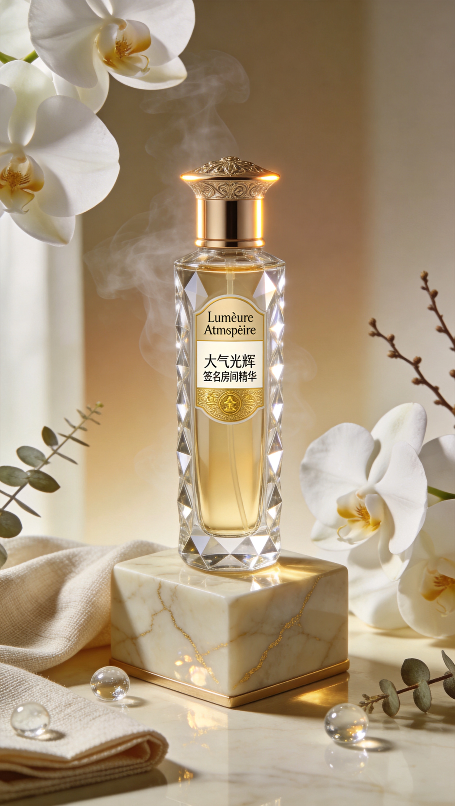 "场景类型": "超写实奢华家居香氛商业摄影",