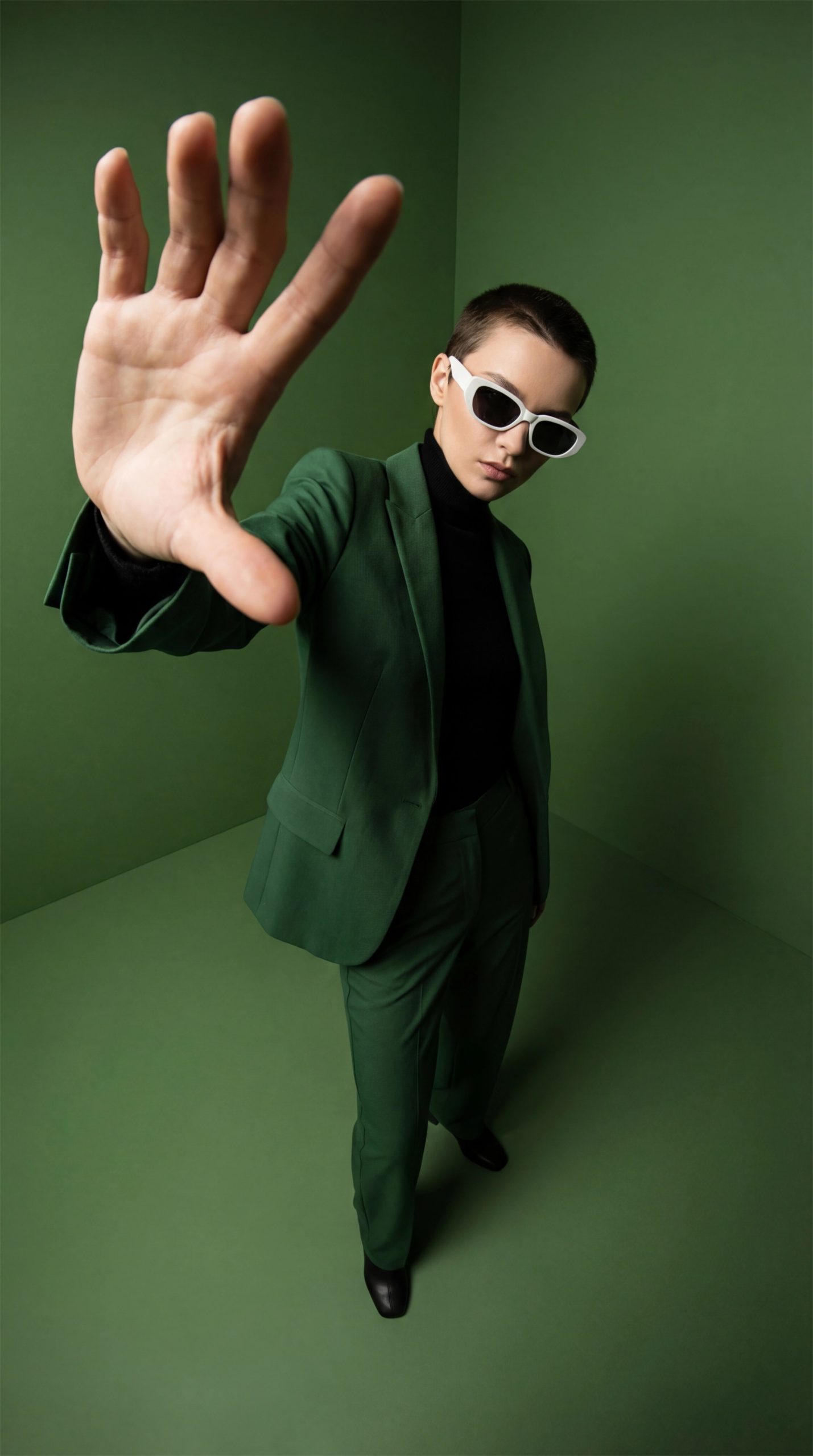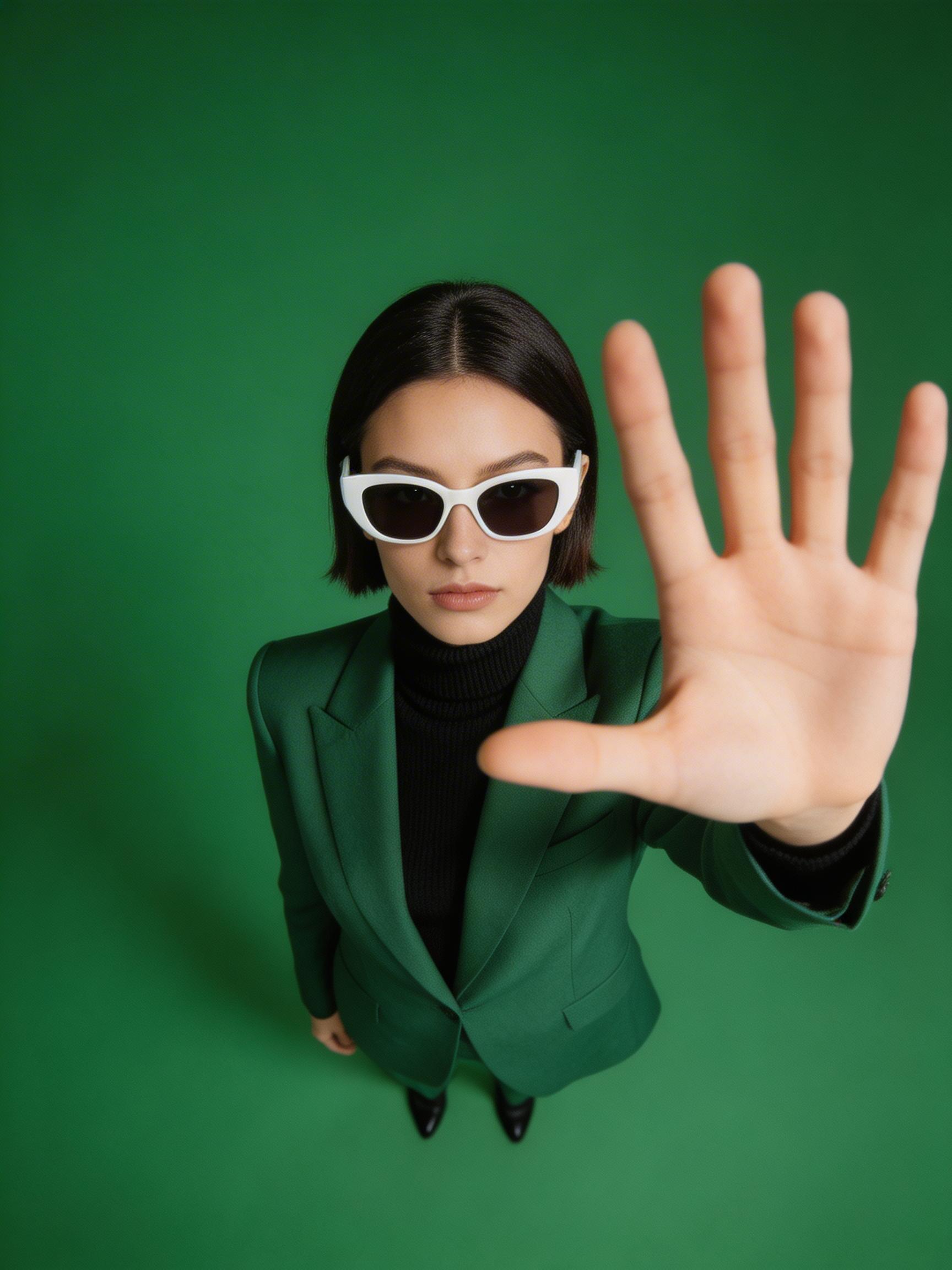 这是一组以单色绿色为主调的现代时尚编辑风格影像作品。短发模特身穿深绿色西装与黑色高领毛衣,搭配白色太阳镜,在纯绿色摄影棚背景前摆出富有张力的姿势。画面采用高角度广角镜头拍摄,利用夸张的透视畸变效果,让手掌向镜头延伸,强化空间纵深与视觉冲击力。整体呈现电影感灯光与超写实细节,在极简构图中塑造出现代、先锋且具有营销视觉风格的高分辨率时尚画面。