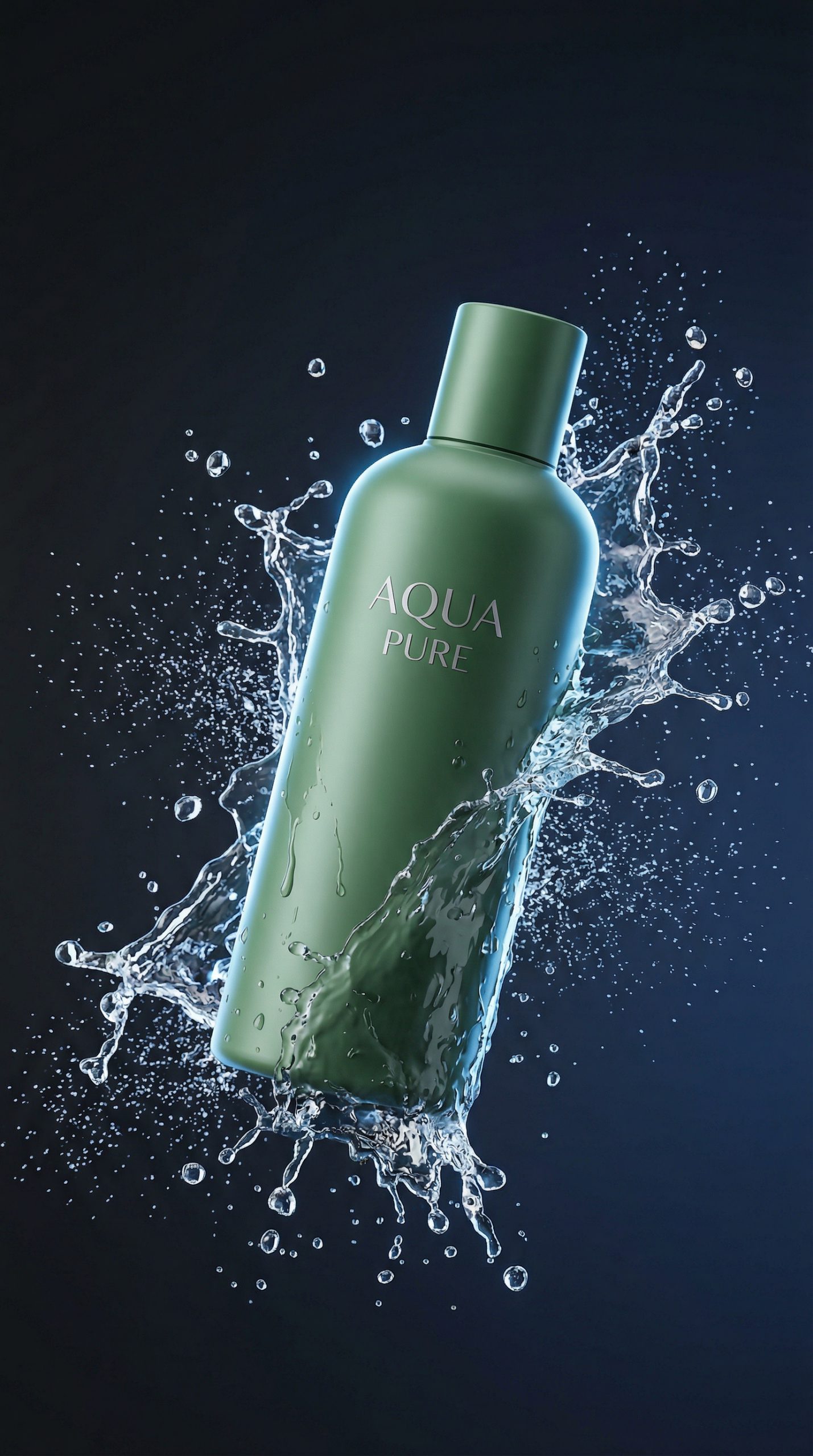 "核心创意": "超写实奢华洗发水瓶在水花中定格瞬间,呈现纯净力量与高端质感",