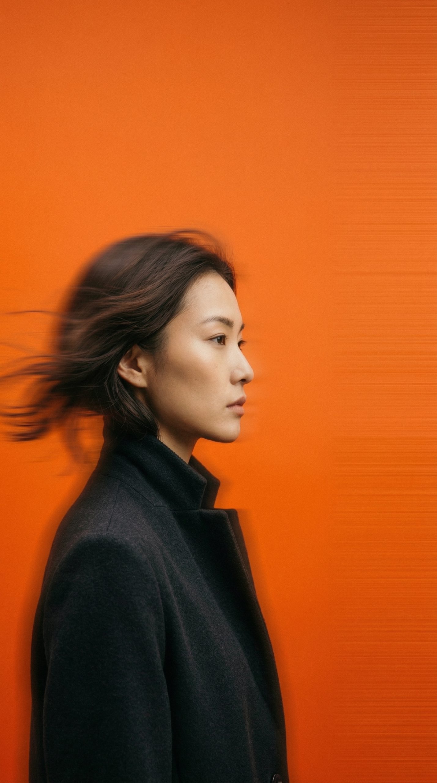 色彩张力:选用高饱和度的亮橙色作为背景,这不仅赋予了画面极强的时尚社论感,也完美衬托出东亚女性深色头发与极简深色大衣的轮廓,使主体从背景中“跳”出来。