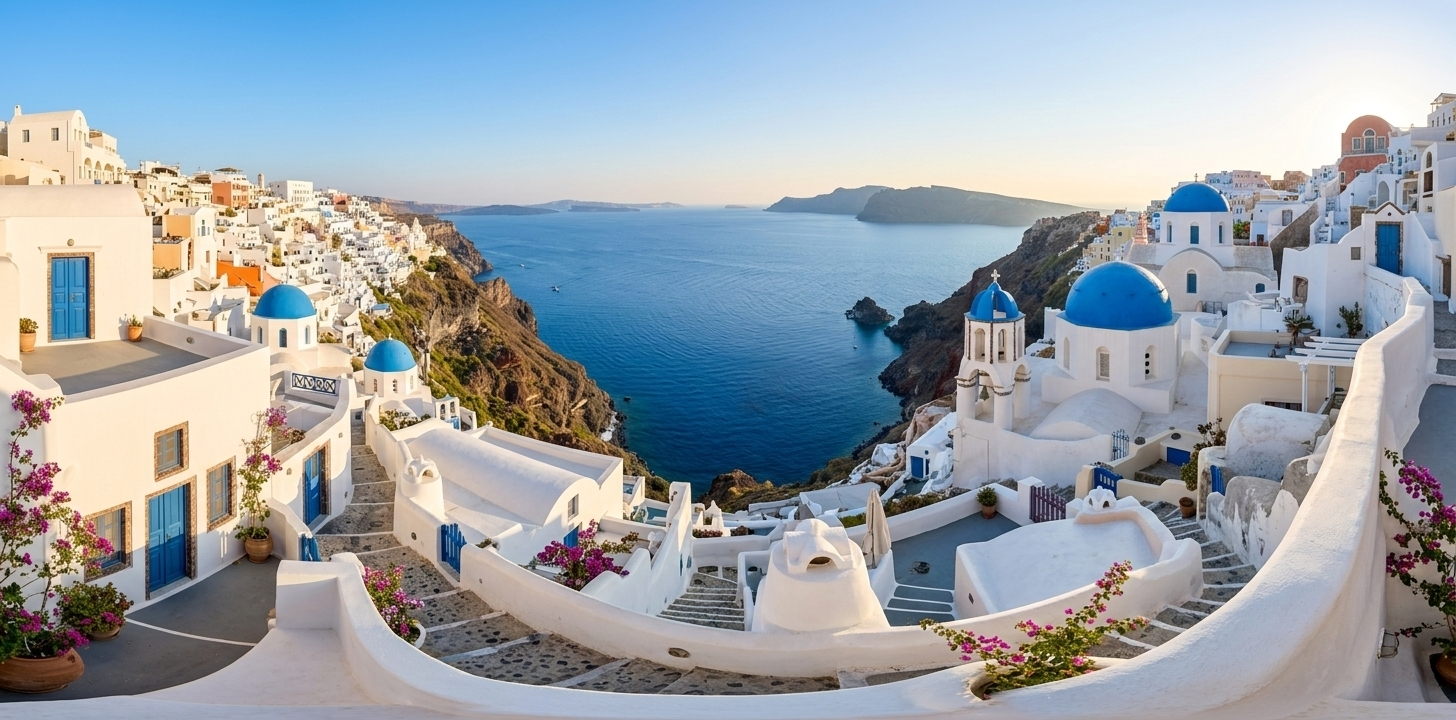 几何美学: 利用360度全景捕捉悬崖上错落有致的白色立方体建筑。通过等距柱状投影,将著名的蓝顶教堂置于视觉重点,让环绕的街道和露台形成向心力,展现出海岛小镇特有的空间韵律。