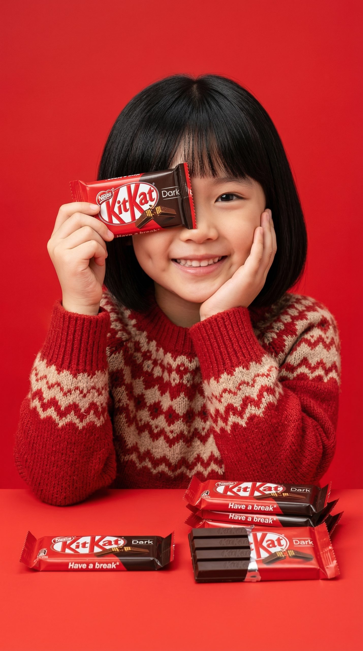 "内容描述": "一幅超写实商业食品广告风格的人像摄影。画面主体是一位可爱的年轻女孩,短黑发并带有整齐刘海,面带温暖微笑。她用一只手托着脸颊,另一只手拿着一根红色包装的KitKat Dark巧克力棒轻轻遮住一只眼睛,姿态俏皮自然。她身穿一件舒适的红色与米色图案冬季针织毛衣,质感柔软。背景与桌面为统一的明亮纯红色,形成强烈的品牌视觉识别。桌子前方摆放着多条KitKat巧克力棒,构成产品展示。画面采用柔和摄影棚灯光,色彩鲜艳通透,整体呈现高端商业食品广告质感。",