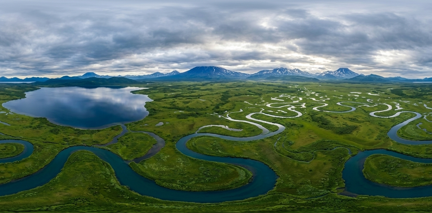 **“蜿蜒河曲的流动韵律感与原始湿地的鲜活生命力”**。利用俄罗斯堪察加半岛标志性的原始湿地河曲与火山湖地貌,创造出置身地球绿肺的静谧与治愈感,定格多云天光下湿地河曲的灵动时刻。