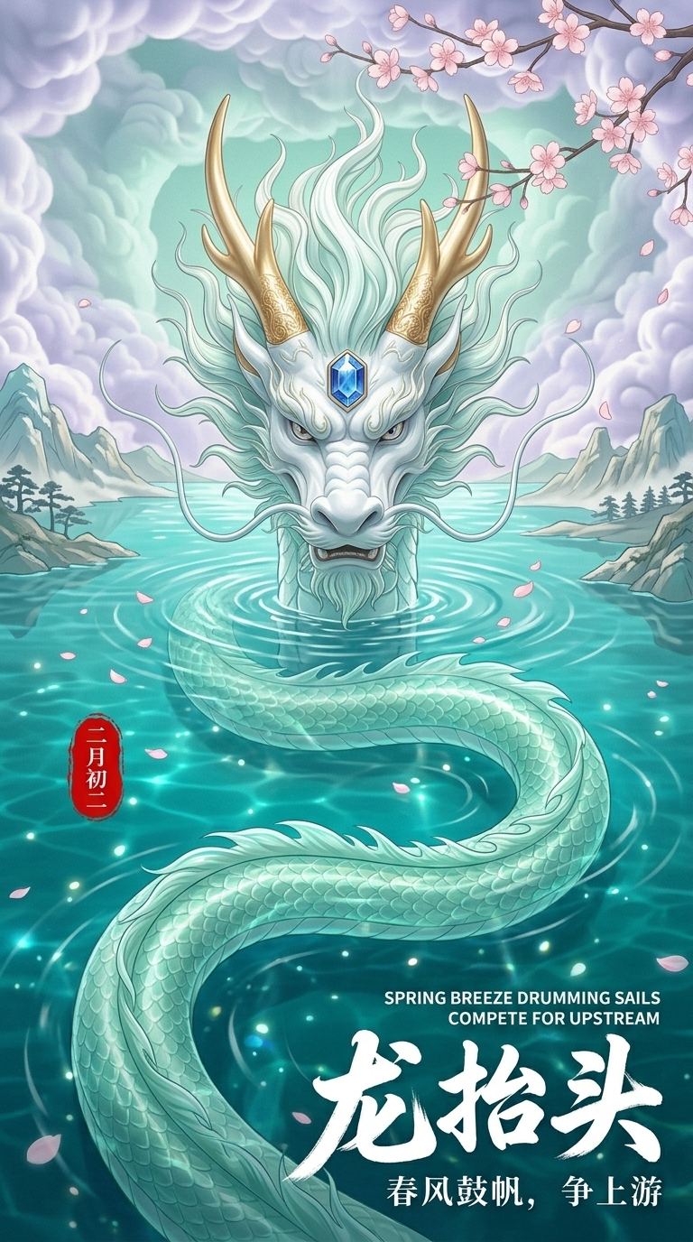 "文案设计": "右下角大型白色书法体:‘龙抬头’;上方英文:‘SPRING BREEZE DRUMMING SAILS COMPETE FOR UPSTREAM’;下方副标题:‘春风鼓帆,争上游’;左侧红色圆形装饰:‘二月初二’",