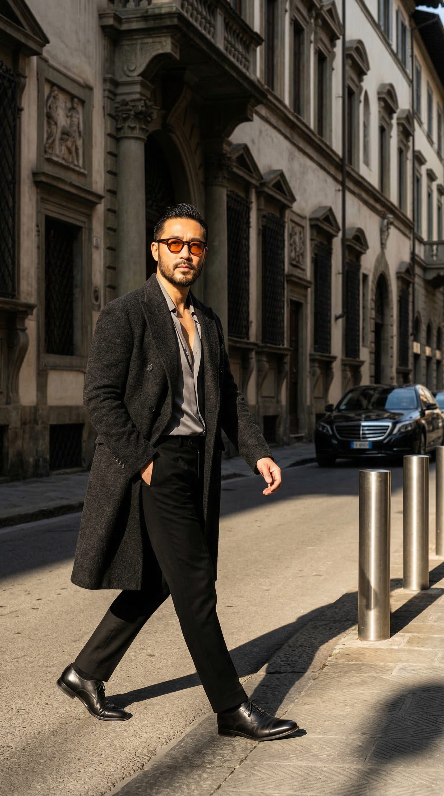 "内容描述": "一幅全景街头时尚社论摄影,描绘一位极具魅力的成年东亚男子,蓄着修剪完美的胡须,正自信地走在历史悠久的欧洲城市街道上。他身穿一件深炭黑色纹理的双排扣长款大衣,内搭一件质地轻盈的灰色开襟丝绸衬衫、黑色西装裤和考究的皮鞋。他戴着一副醒目的焦橙色镜片墨镜,左手自然地插在大衣口袋里。正午强烈的定向阳光从侧方45度角切入,在铺设平整的街道上投射出深邃且边缘锐利的阴影。背景是经典的意大利风格建筑,带有华丽的石雕细节、拱门和风化的纹理,右侧路边立着圆柱形不锈钢路桩。画面呈现出极高的明暗对比,金色的阳光照亮了他的侧脸和衣物的织物纹理。采用50mm人像镜头拍摄,焦点极度锐利,完美捕捉了行走时的从容与都市英雄主义气场。高动态范围,专业男装社论质感,无颗粒感,八千像素超清画质。",