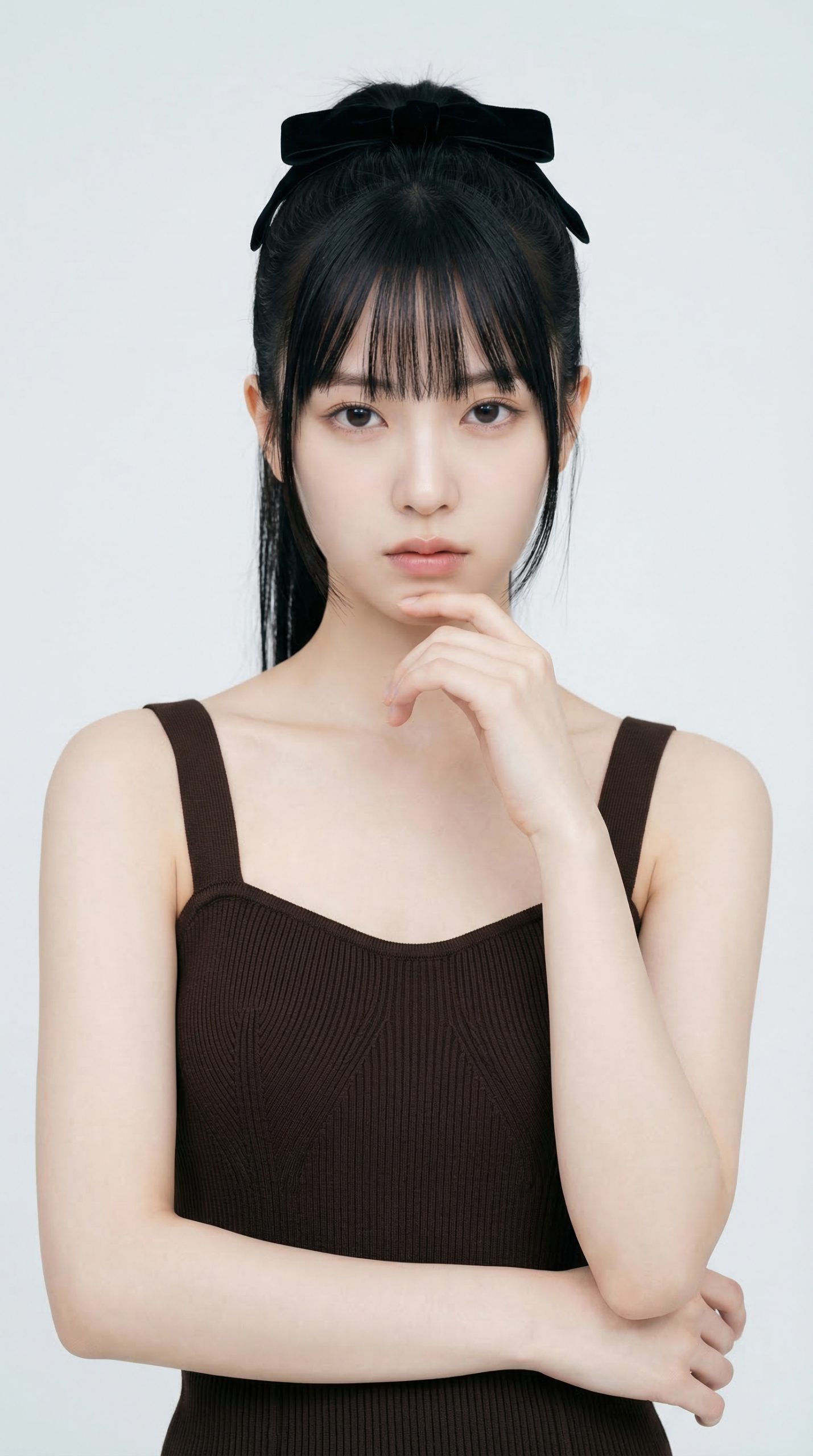 质感与色彩:服饰采用具有罗纹纹理的深巧克力色针织材质,与纯净的浅灰色背景形成鲜明对比,突出了人物的肤色和轮廓。