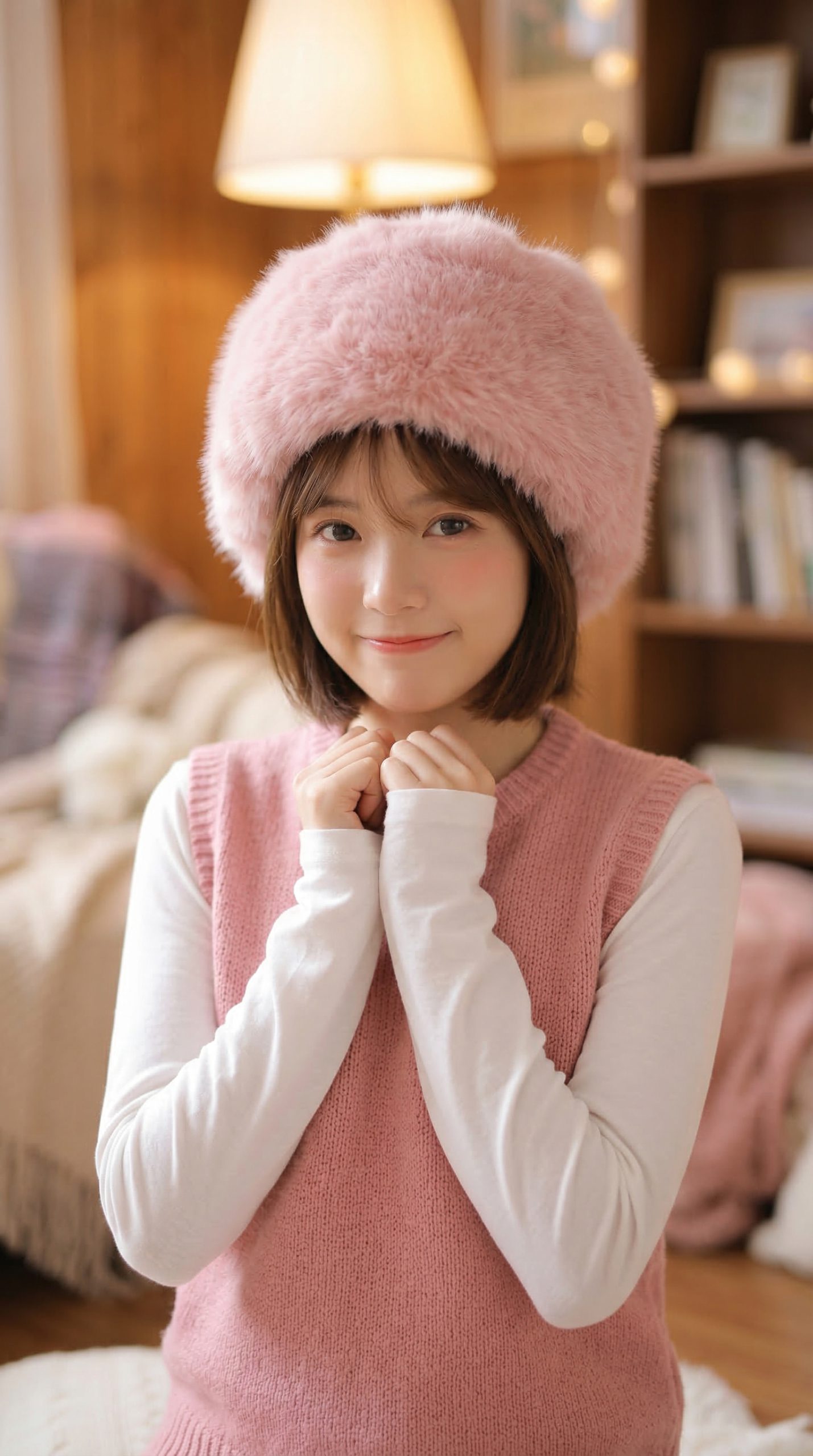 简介: 这张图片是一个中景镜头,展示了一位女性在室内场景。她身穿一件粉色羊毛(或针织)无袖上衣和一件白色长袖衬衫,戴着一顶巨大的粉色毛绒冬帽。她双手交叠放在胸前,目光有些许腼腆或害羞,笑容甜美。背景是一个模糊的、带有温馨元素的室内环境。