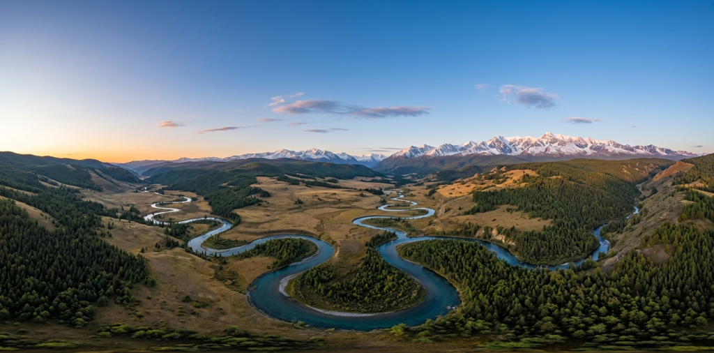 本提示词还原俄罗斯阿尔泰山区的曲流河与雪山日出奇观,以超高空无人机视角,完整呈现 360° 球形全景下的山地河谷盛景。画面核心聚焦蜿蜒的蓝绿色曲流河,河道在广袤的河谷草甸与森林间自然穿梭,形成优美的蛇形轮廓,河水澄澈通透,与两侧的金黄草甸、深绿森林形成鲜明色彩对比;远处是连绵的雪山山脉,山顶积雪在日出暖光下熠熠生辉,与河谷的暖色调形成冷暖呼应;日出时分的阳光给整个场景镀上一层柔和的暖金色,澄澈的蓝天搭配轻薄流云,整体画面呈现阿尔泰山区的辽阔、静谧与极致的山地自然美学。本提示词生成内容可用于山地风光创作、地理科普素材、VR 山地河谷漫游、自然文旅宣传等多个场景。