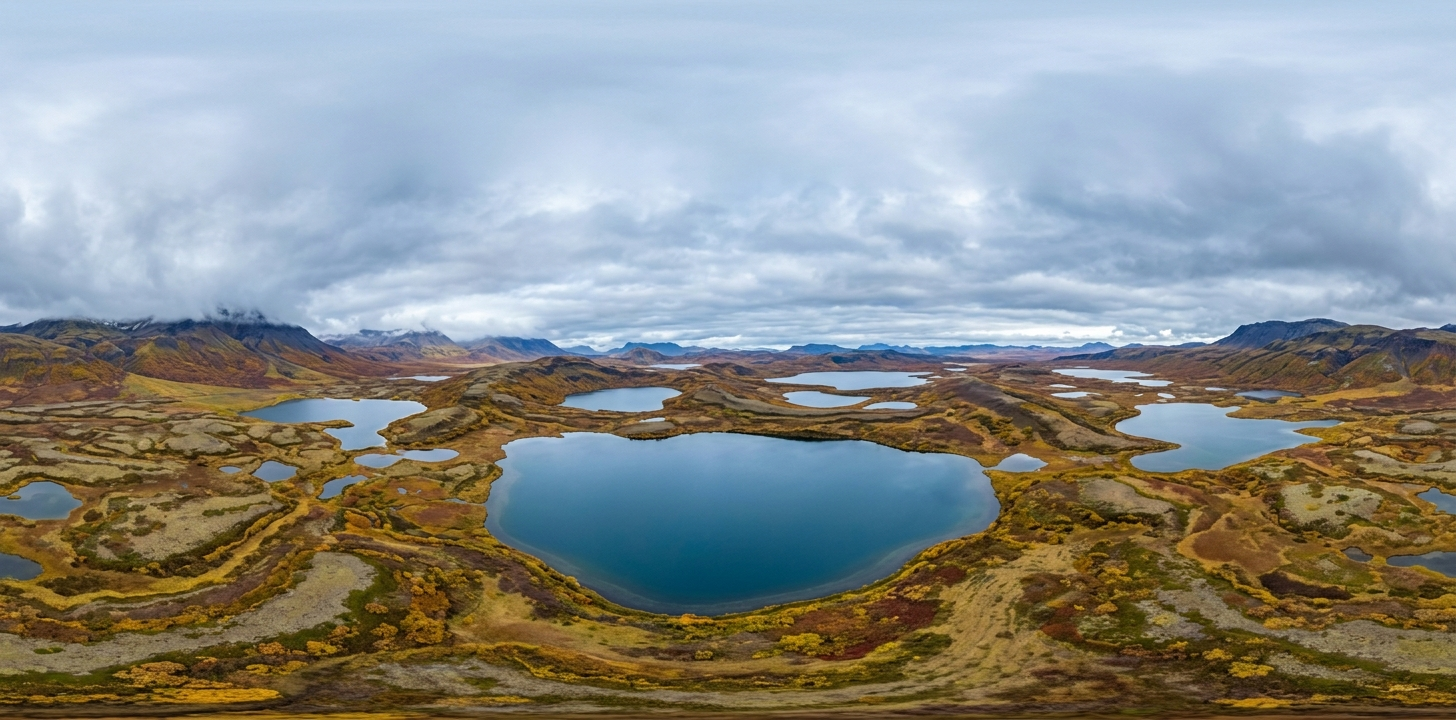 本提示词还原冰岛高地苔原的秋季彩林与湖泊奇观,以超高空无人机视角,完整呈现 360° 球形全景下的极地秋季盛景。画面核心聚焦广袤的苔原彩林,植被呈现出金黄、橙红、深绿的渐变色彩,层次丰富,与散落的蓝色湖泊形成鲜明色彩对比;远处的山脉被云雾半遮半掩,云层低垂,完整呈现冰岛高地的辽阔、苍茫与极致的秋季色彩美学。本提示词生成内容可用于极地生态科普、秋季风光创作、VR 苔原漫游、环保主题内容创作等多个场景。