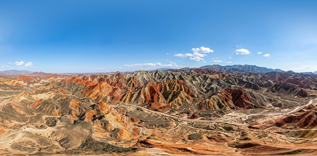 本提示词精准还原中国张掖七彩丹霞的彩色丘陵地貌奇观,以高空无人机视角,完整呈现 360° 球形全景下的丹霞地貌盛景。画面核心聚焦大面积彩色丘陵山体,岩层呈现红、橙、黄、棕、灰的自然渐变色彩,层理纹理清晰,沟壑纵横交错,完整还原丹霞地貌 “色如渥丹,灿若明霞” 的核心特色;中景是广阔的荒漠戈壁平原,蜿蜒的干枯河道与远方层叠的彩色山峦形成自然呼应,完整呈现西北干旱地貌的辽阔与壮阔;澄澈的蓝天搭配少量稀疏白云,完整呈现丹霞地貌在正午日光下的极致色彩表现力。本提示词生成内容可用于文旅宣传素材、地理科普内容、VR 地貌场景漫游、国风自然创作等多个场景。