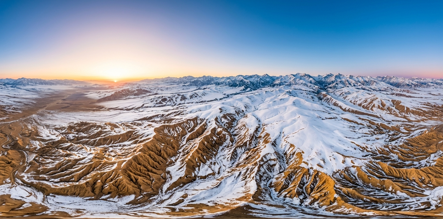 本提示词还原中国天山山脉的戈壁雪原日出奇观,以超高空无人机视角,完整呈现 360° 球形全景下的戈壁雪原盛景。画面核心聚焦广袤的戈壁雪原,地面呈现出暖金色的沟壑纹理与白色积雪的强烈对比,光影层次丰富;远处是连绵的雪山山脉,山顶积雪在日出暖光下熠熠生辉,与戈壁的暖色调形成冷暖呼应;日出时分的阳光给整个场景镀上一层柔和的暖金色,澄澈的蓝天搭配渐变的暖橙天际线,整体画面呈现天山戈壁的辽阔、苍茫与极致的自然美学。本提示词生成内容可用于山地风光创作、地理科普素材、VR 戈壁漫游、自然文旅宣传等多个场景。