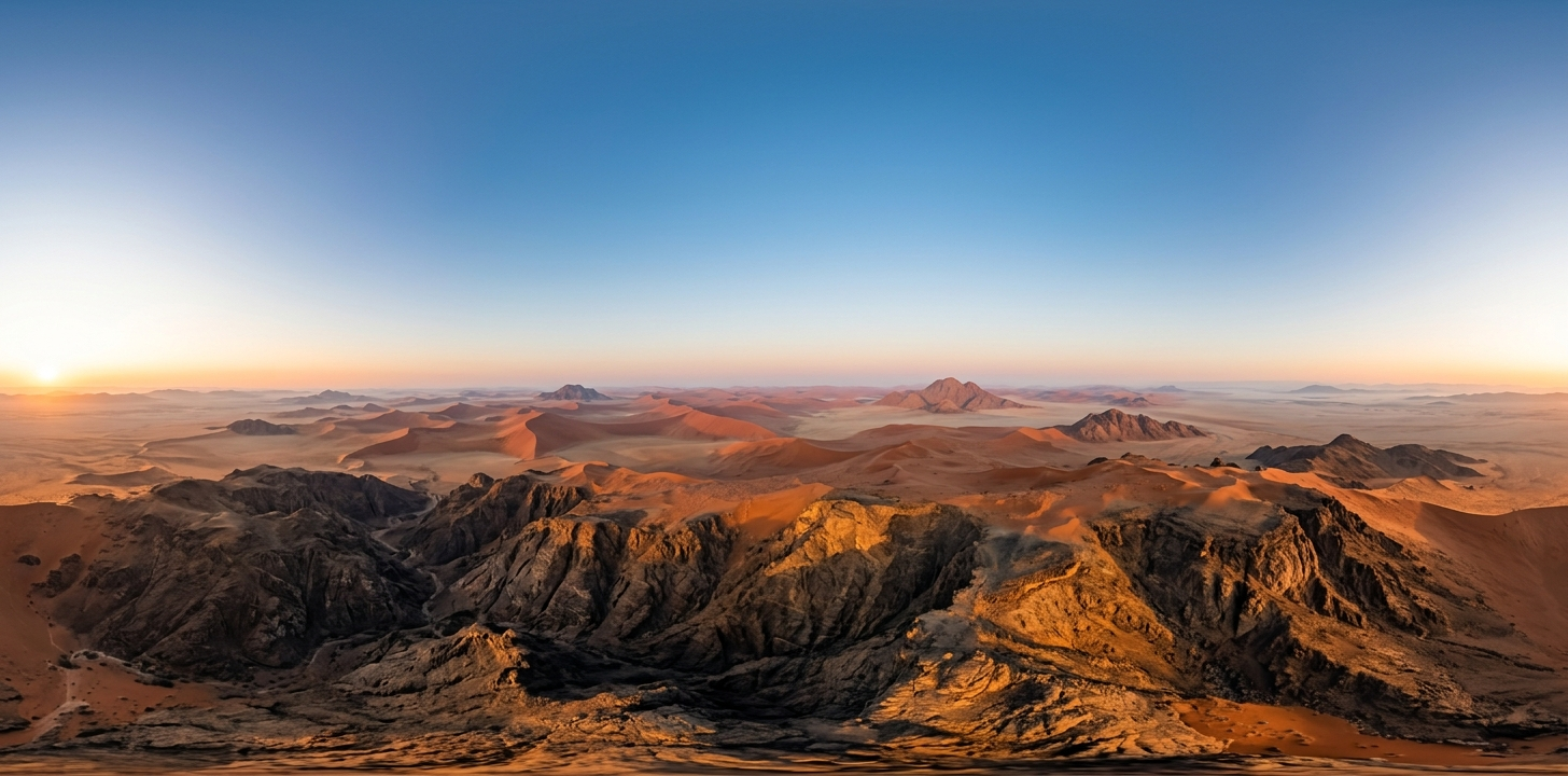 本提示词还原纳米比亚纳米布沙漠的峡谷地貌日出奇观,以高空无人机视角,完整呈现 360° 球形全景下的沙漠盛景。画面核心聚焦红色的沙漠平原与黑色的峡谷岩山,岩山轮廓硬朗,岩壁纹理清晰,在日出暖光的照射下形成强烈的明暗对比;沙漠平原广袤无垠,向天际线无限延伸,远处的岩山若隐若现,日出时分的阳光给整个场景镀上一层柔和的暖金色,澄澈的蓝天搭配轻薄的晨雾,整体画面呈现沙漠峡谷的辽阔、苍茫、野性与极致的地质美学。本提示词生成内容可用于地理科普内容、沙漠主题创作、VR 沙漠漫游、自然纪录片素材等多个场景。