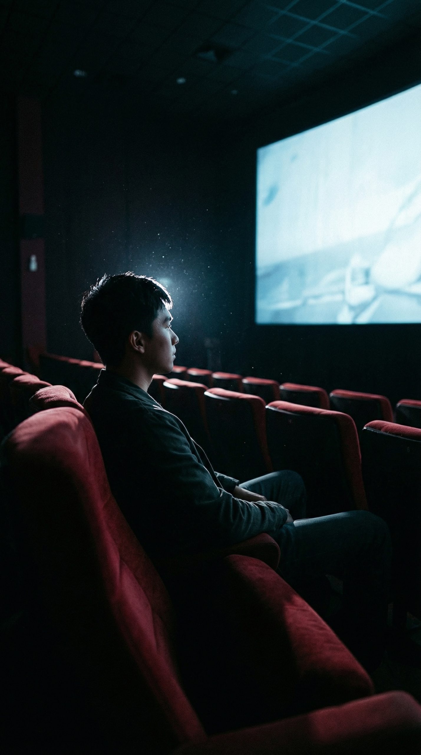 "内容描述": "一幅极具叙事感的电影级肖像。一位年轻的东亚男性(基于参考图,清透五官、黑色短发)正独自坐在一间巨大的、空旷的电影院放映厅中央。他正面对巨大的银幕,相机位于他侧后方约45度的位置,同时捕捉到了他的侧影和远处银幕的一角。画面中唯一的照明来源是银幕散发的微弱、闪烁的冷色调光芒,这道柔和的光精准地照亮了他的侧脸、发丝边缘以及鼻梁,使他在黑暗的背景中呈现出迷人的轮廓。他周围是成排延伸至黑暗中的红色天鹅绒空座椅。他穿着极简的现代休闲服:深色夹克内搭素色T恤,牛仔裤与平底运动鞋。姿态自然、放松且略显颓废,正凝神注视着银幕。高动态范围(HDR),深邃的暗部细节,空气感十足的丁达尔效应,超写实皮肤纹理,8K极致电影场景构图。",