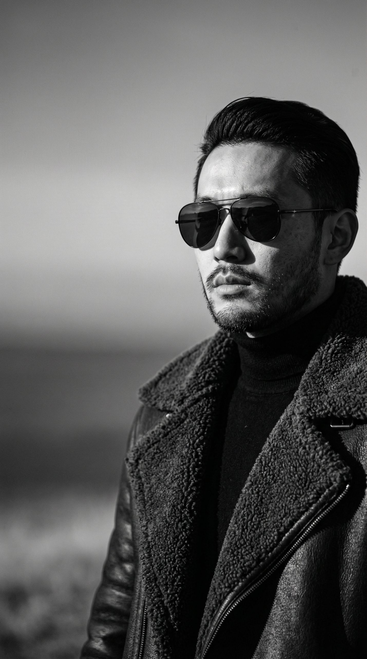 "内容描述": "一幅极具冲击力的黑白电影感肖像。一位气质硬朗的年轻东亚男性(基于参考图,留着精致的短胡须与利落发型)侧身45度伫立。他戴着漆黑的飞行员墨镜,身穿一件厚重的深色羊羔绒领大衣,内搭黑色高领毛衣。强烈的、带有硬核质感的45度侧向自然光斜射在他脸上,在鼻梁和左侧脸颊留下明亮的高光,而右侧面部则沉浸在深邃、锐利的阴影中(Chiaroscuro)。背景是极致虚化的荒野远景,地平线与天空形成柔和的灰色渐变。采用85mm长焦镜头拍摄,焦点极度锐利地锁定在墨镜边缘与羊羔绒领的纤维纹理上。画面呈现高对比度的单色调(Monochrome),带有细腻的胶片颗粒感,展现出一种冷静、深沉且极具张力的都市硬汉美感。",