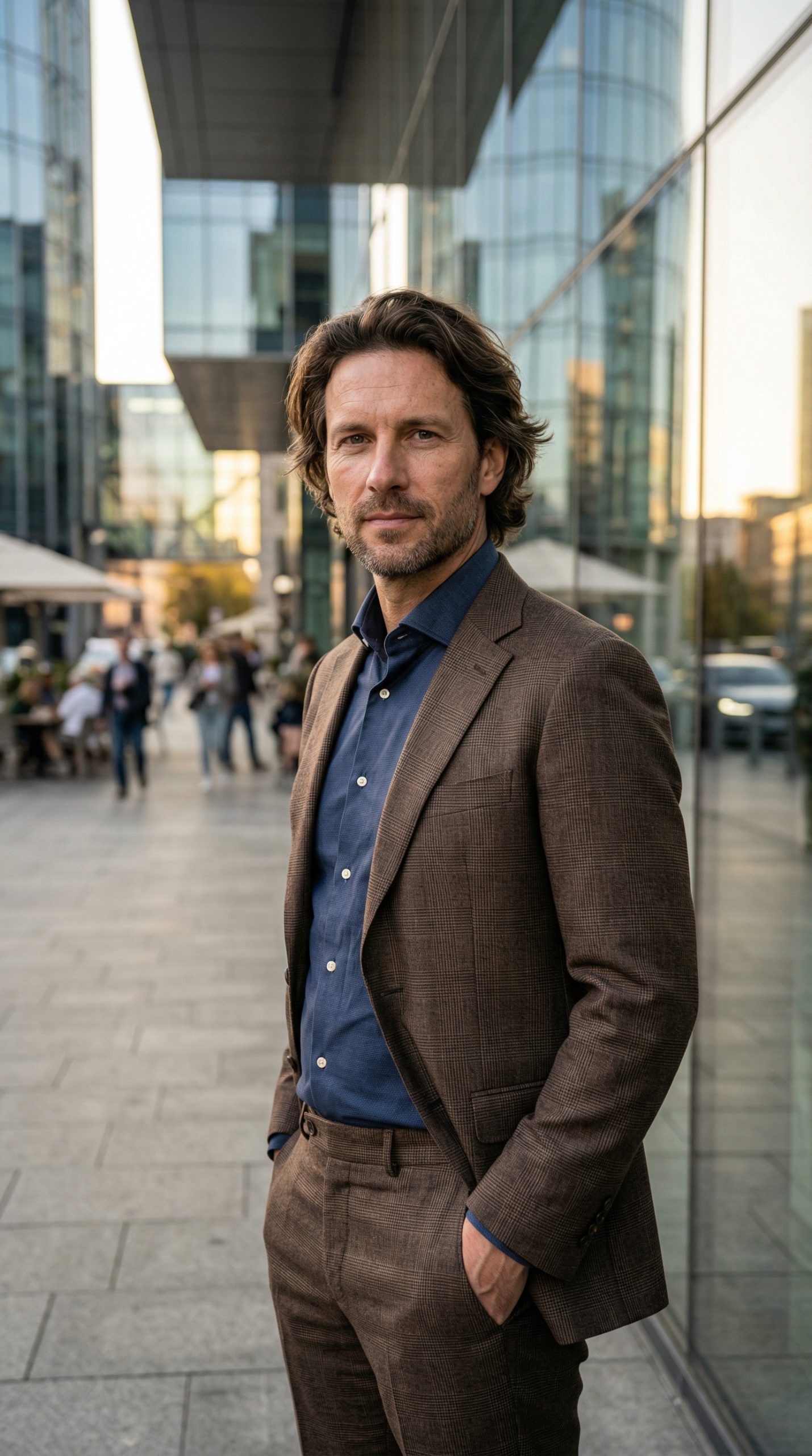 "关键要素": ["格纹西装纹理", "深色衬衫领口细节", "都市玻璃幕墙反光", "自然面部光影"],