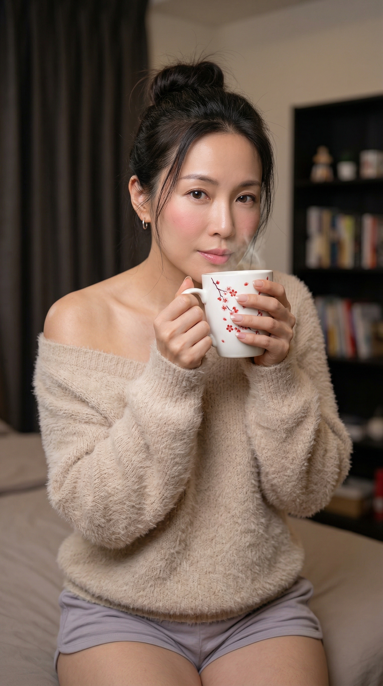 特定的放松姿态: “微微前倾,双手捧着陶瓷杯,靠近下巴”的动作,配合“肩膀微微抬起”,生动刻画出她在寒冷或放松状态下寻求温暖的本能反应。从左肩随意滑落的宽大毛衣,进一步强化了这种随意和不受拘束的舒适感。