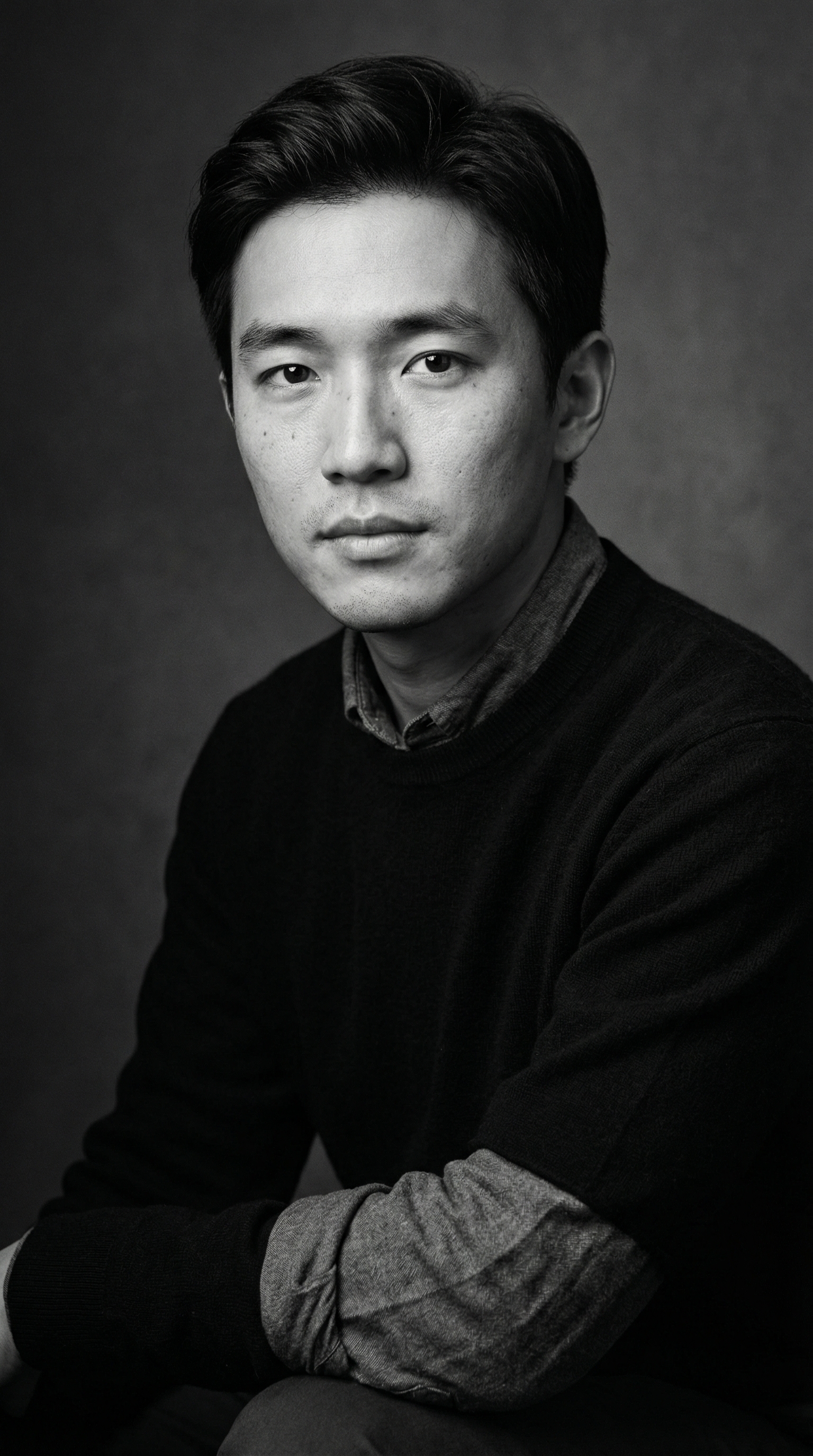 "内容描述": "一张超细致的黑白摄影棚东亚年轻男性肖像,灵感来自安妮·莱博维茨戏剧性且情感丰富的肖像摄影风格。主体坐姿放松但有意图,躯干略微偏离镜头20度,肩膀柔软,头回转镜头,平静内省,直接稳定的眼神交流。",