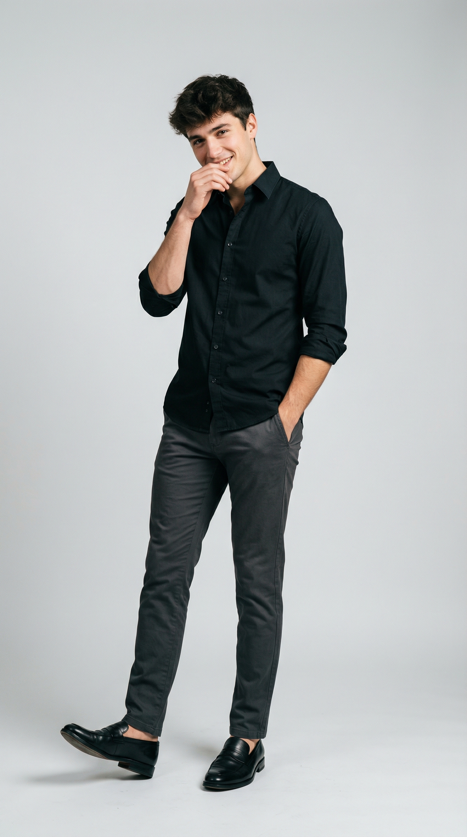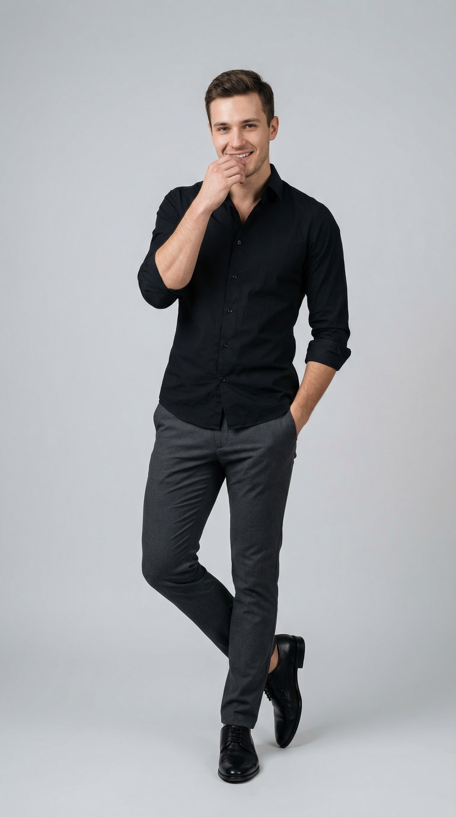 "内容描述": "一尊时尚青年的全身肖像,站在浅灰色背景前。他穿着合身的黑色衬衫(袖子卷起)、深灰色修身裤和黑色抛光皮鞋。他一手插在裤兜里,另一手靠近嘴巴,微笑着,微微抬起一条腿,姿态随性。灯光柔和均匀,突显出他的自然特征。",