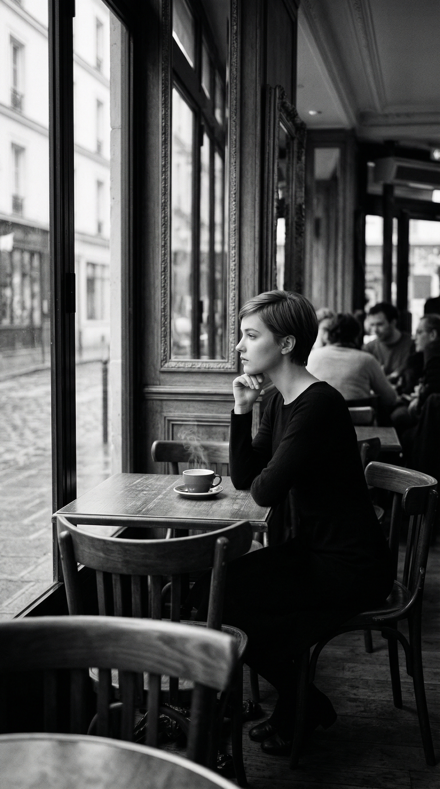 "内容描述": "一位留着干练短发的年轻女性,独自坐在巴黎风格咖啡馆的木桌旁,手托香腮,凝视着窗外的卵石路面,神情忧郁而深邃。",