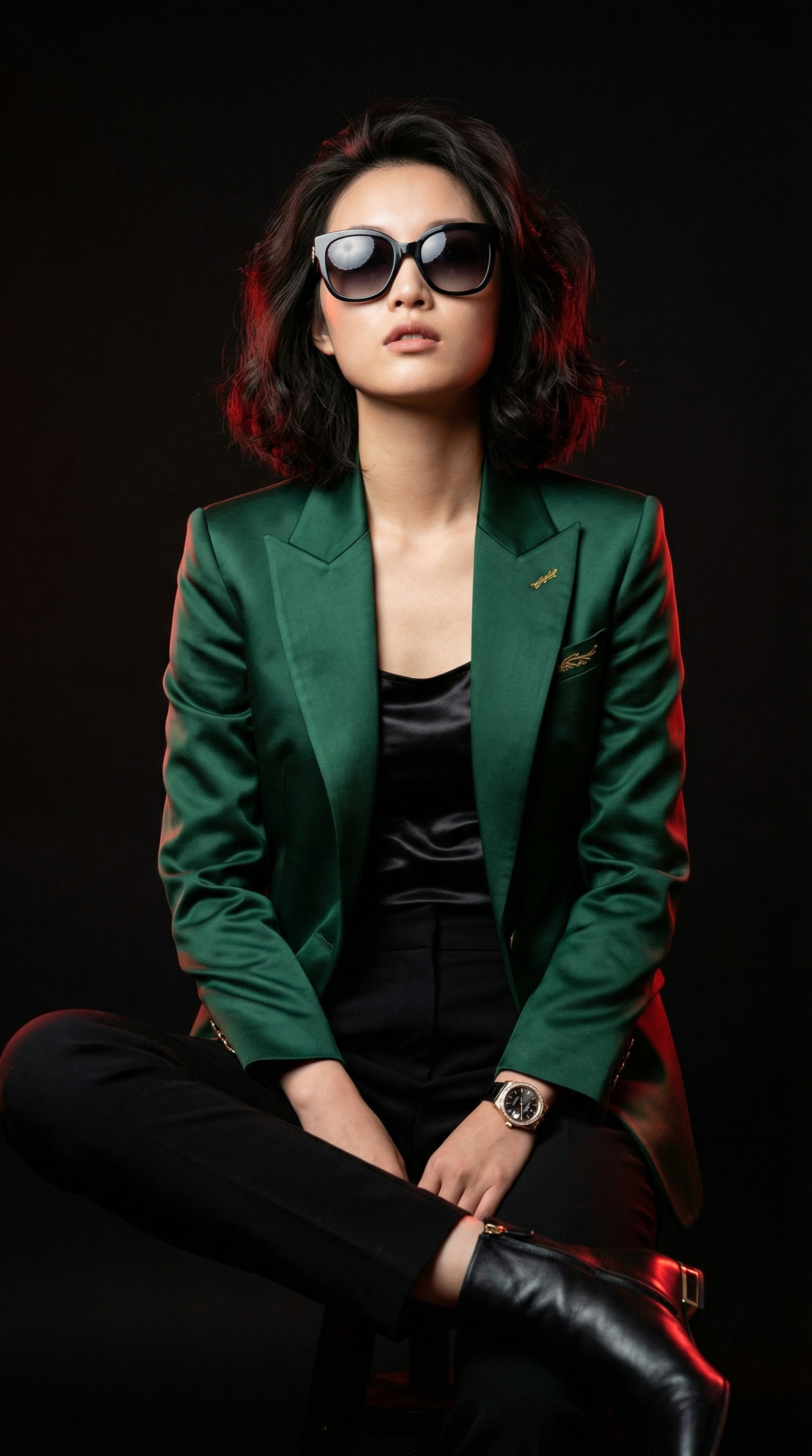 "内容描述": "一个超写实的电影感时尚人像,直接由上传的照片生成。保持与参考图像中相同的人物,精确地保留原始的面部结构、比例、肤色和身份,具有无可挑剔的真实感。中景镜头构图:女孩挺直地坐着,摆出自信的编辑姿势,直视镜头,头部稍微抬起,投射出优雅和安静的力量。她的头发看起来自然凌乱而蓬松,具有柔软的编辑纹理,造型整洁,没有发丝落在她的脸上,给人一种精致而毫不费力的轻松感觉。她穿着一件具有大胆当代风格的超高级时装。服装特征包括丝绸缎、结构化的设计师皮革或点缀的定制材料。这套服装使用丰富、引人注目的色彩调色板(深翡翠、红宝石红、金属金、皇家蓝或光滑的黑色口音),具有现代编辑剪裁、锋利的线条和定制级别的细节。配饰提升了时尚感:具有优雅超大框架和反射镜片的设计师太阳镜、具有抛光金属和宝石细节的高级腕表、高定时装鞋履(如具有光滑皮革和金属口音的设计师高跟鞋或定制靴子)。整体造型感觉像高端Vogue或品牌宣传活动。背景:深黑色纯电影背景,两侧有强烈的红色电影轮廓光,在头部、肩膀和剪影周围创造戏剧性的发光边缘和雕塑般的轮廓光。光线设置为专业工作室质量:面部柔和的主光,平衡了环绕主体的红色侧光,突出了皮肤纹理、面料、反射配饰和精细细节。电影构图:光滑、强大、现代、编辑和超写实,具有高端时尚摄影美学。相机设置:85mm人像镜头、f/2光圈、ISO 200、1/200s快门速度、面部清晰锐利、浅景深、主体和背景之间的戏剧性对比。超详细、光栅摄影、高动态范围保留所有细节,8K分辨率。",