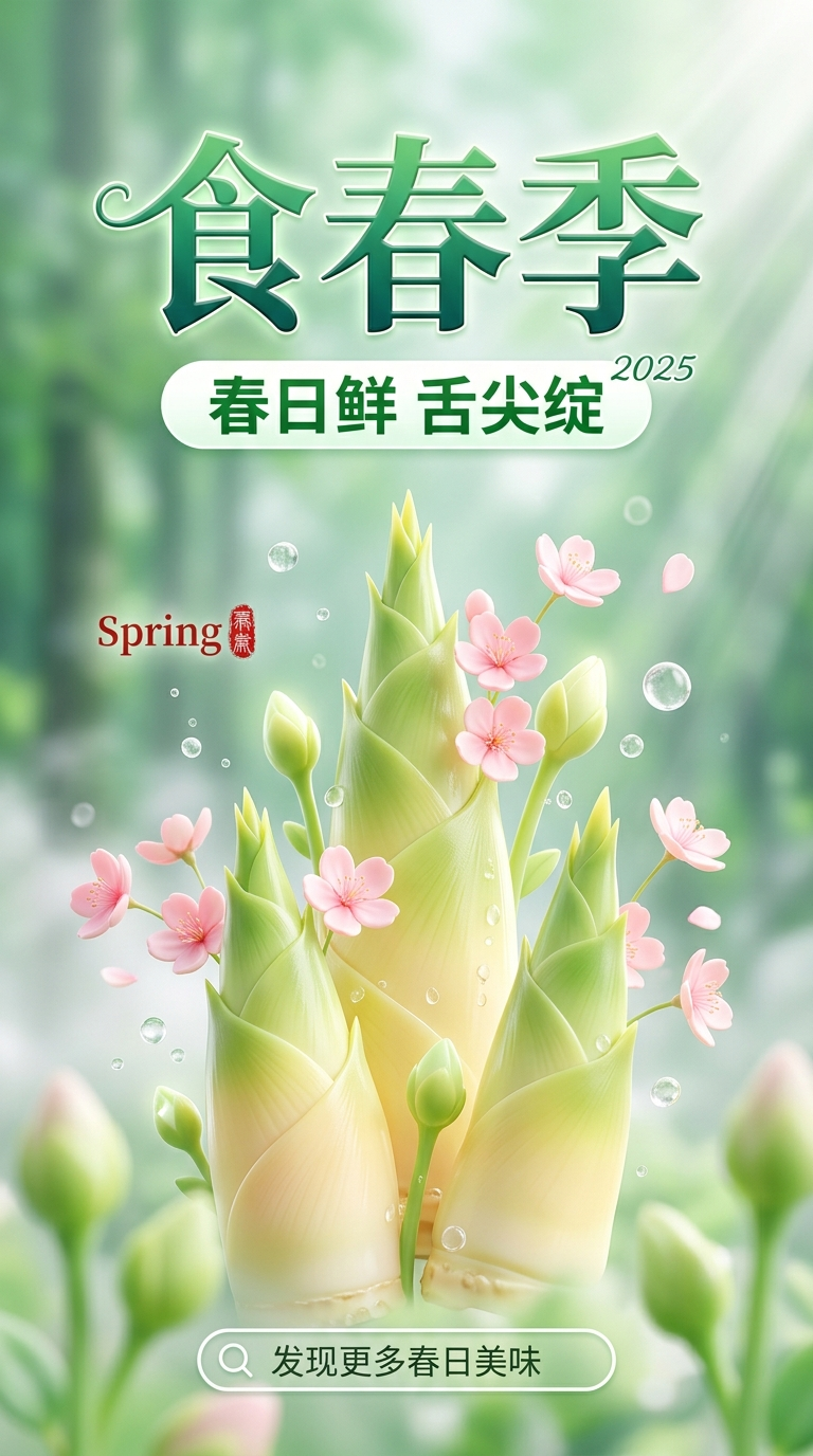 "主体": "三颗高低错落的3D春笋,由底部的嫩黄色向顶部的青绿色过渡,质感Q弹润泽,笋壳纹理清晰可见。",
